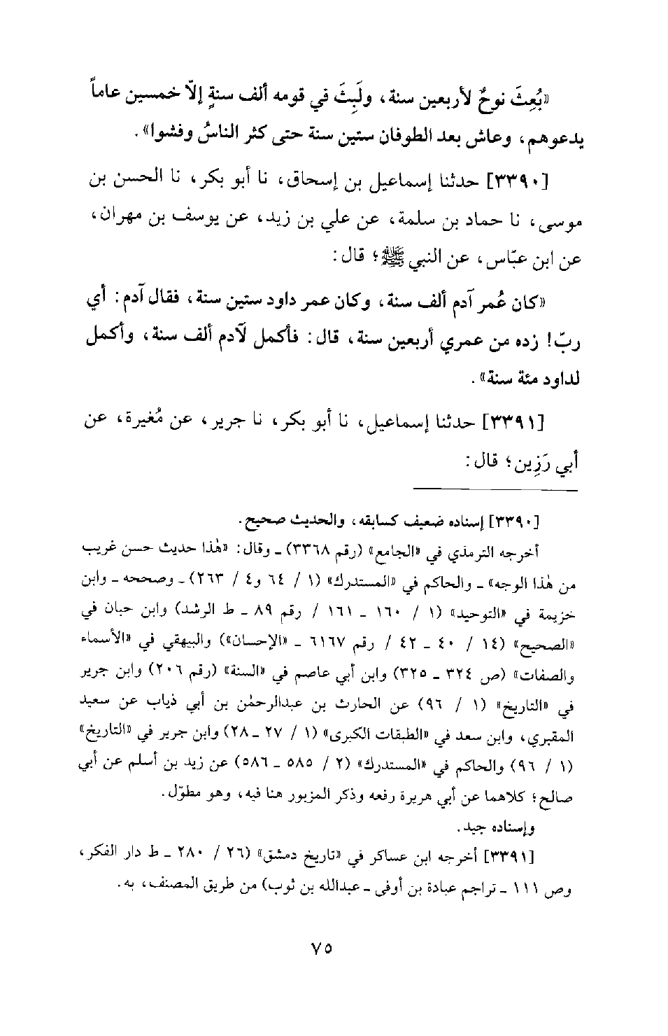 3390 - حَدَّثَنَا إِسْمَاعِيلُ بْنُ إِسْحَاقَ، نا أَبُو بَكْرٍ، نا الْحَسَنُ بْنُ مُوسَى، نا حَمَّادُ بْنُ سَلَمَةَ، عَنْ عَلِيِّ بْنِ زَيْدٍ، عَنْ يُوسُفَ بْنِ مِهْرَانَ، عَنِ ابْنِ عَبَّاسٍ، عَنِ النَّبِيِّ صَلَّى اللَّهُ عَلَيْهِ وَسَلَّمَ؛ قَالَ: «كَانَ عُمْرُ آدَمَ أَلْفَ سَنَةٍ، وَكَانَ عُمْرُ دَاوُدَ سِتِّينَ سَنَةً، فَقَالَ آدَمُ: أَيْ رَبِّ! زِدْهُ مِنْ عُمْرِي أَرْبَعِينَ سَنَةً، قَالَ: فَأَكْمَلَ لآدَمَ أَلْفَ سَنَةٍ، وأكمل لداود مئة سَنَةٍ»