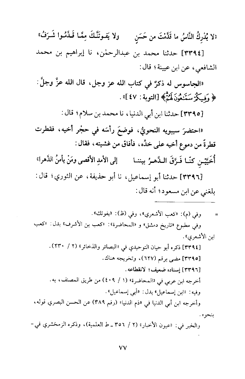 3394 - حَدَّثَنَا مُحَمَّدُ بْنُ عَبْدِ الرَّحْمَنِ، نا إِبْرَاهِيمُ بْنُ مُحَمَّدٍ الشَّافِعِيُّ، عَنِ ابْنِ عُيَيْنَةَ؛ قَالَ: الْجَاسُوسُ لَهُ ذِكْرٌ فِي كِتَابِ اللهِ عَزَّ وَجَلَّ، قَالَ اللهُ عَزَّ وَجَلَّ: {وفيكم سماعون لهم} [التوبة: 47] .