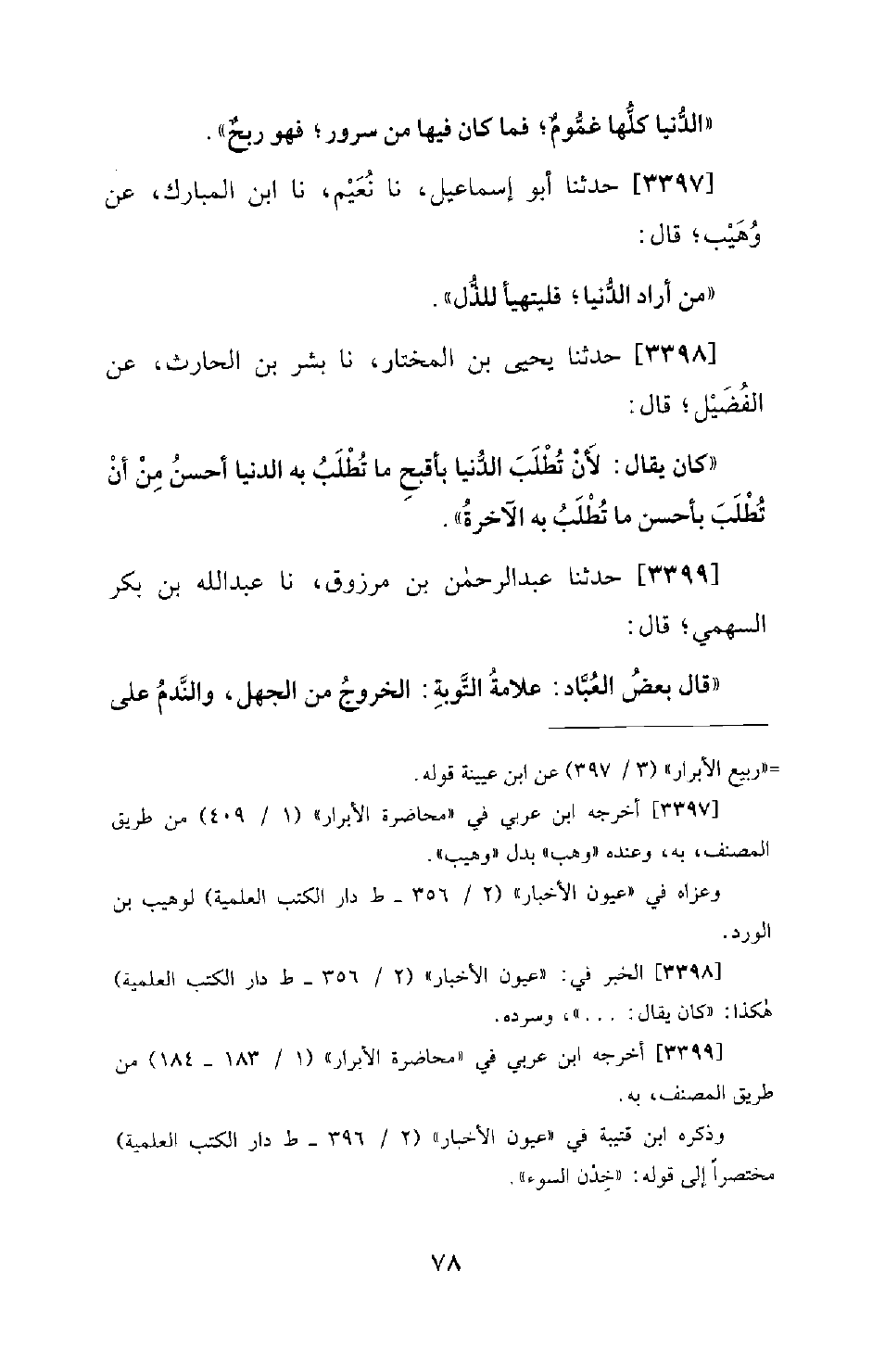 3398 - حَدَّثَنَا يَحْيَى بْنُ الْمُخْتَارِ، نا بِشْرُ بْنُ الْحَارِثِ، عَنِ الْفُضَيْلِ؛ قَالَ: كَانَ يُقَالُ: لأَنْ تُطْلَبَ الدُّنْيَا بِأَقْبَحِ مَا تُطْلَبُ بِهِ الدُّنْيَا أَحْسَنُ مِنْ أَنْ تُطْلَبَ بِأَحْسَنِ مَا تُطْلَبُ بِهِ الآخِرَةُ.