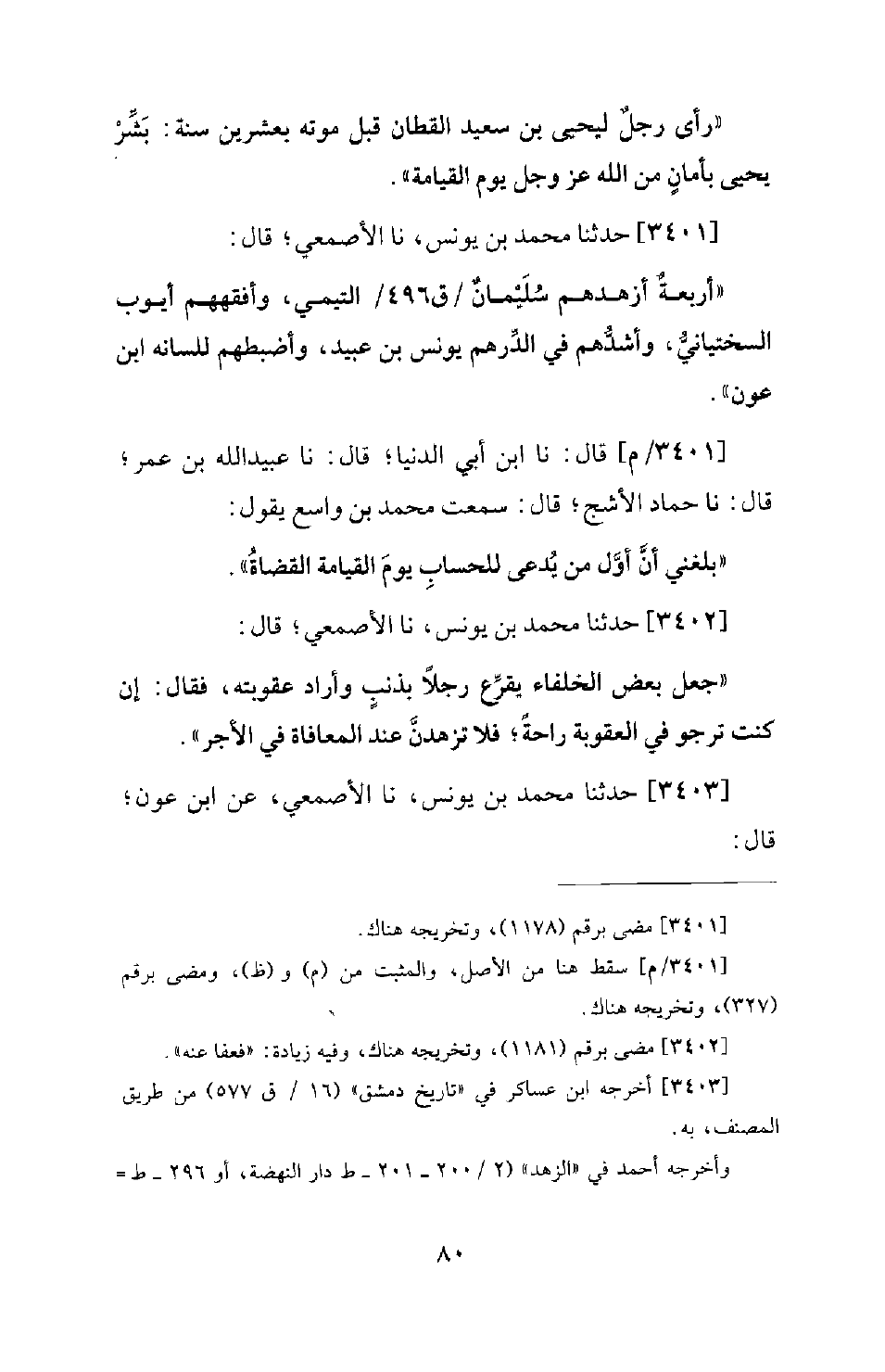 3401 - حدثنا مُحَمَّدُ بْنُ يُونُسَ، نا الأَصْمَعِيُّ؛ قَالَ: أَرْبَعَةٌ أَزْهَدُهُمْ سُلَيْمَانُ التَّيْمِيُّ، وَأَفْقَهُهُمْ أَيُّوبُ السَّخْتِيَانِيُّ، وَأَشَدُّهُمْ فِي الدِّرْهَمِ يُونُسُ بْنُ عُبَيْدٍ، وَأَضْبَطُهُمْ لِلِسَانِهِ ابْنُ عَوْنٍ.