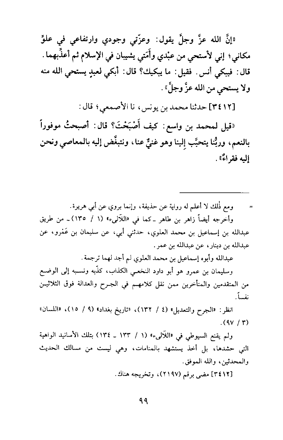 3412 - حَدَّثَنَا مُحَمَّدُ بْنُ يُونُسَ، نا الأَصْمَعِيُّ؛ قَالَ: قِيلَ لِمُحَمَّدِ بْنِ وَاسِعٍ: كَيْفَ أَصْبَحْتَ؟ قَالَ: أَصْبَحْتُ مَوْفُورًا بِالنِّعَمِ، وَرَبُّنَا يَتَحَبَّبُ إِلَيْنَا وَهُوَ غَنِيٌّ عَنَّا، وَنَتَبَغَّضُ إِلَيْهِ بِالْمَعَاصِي وَنَحْنُ إِلَيْهِ فُقَرَاءُ.