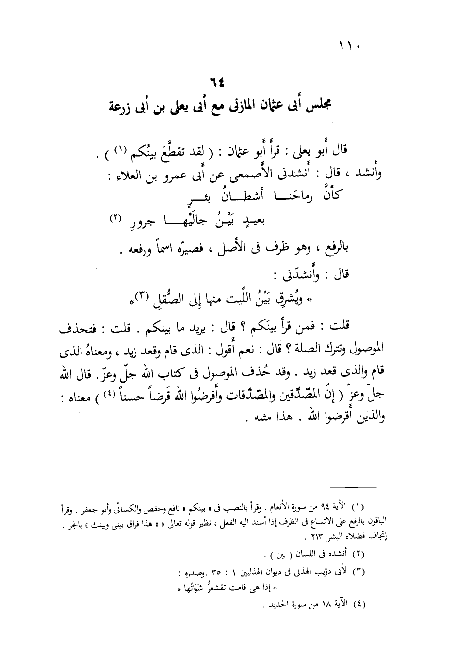 قلت: فمن قرأ بينكم؟ قال: يريد ما بينكم. قلت: فتحذف الموصول وتترك الصلة؟ قال: نعم أقول: الذي قام وقعد زيد، ومعناه الذي قام والذي قعد زيد. وقد حذف الموصوف في كتاب الله جل وعز. قال الله جل وعز: {إِنَّ الْمُصَّدِّقِينَ وَالْمُصَّدِّقَاتِ وَأَقْرَضُوا اللَّهَ قرضاً حسناً} معناه: والذين أقرضوا الله. هذا مثله.