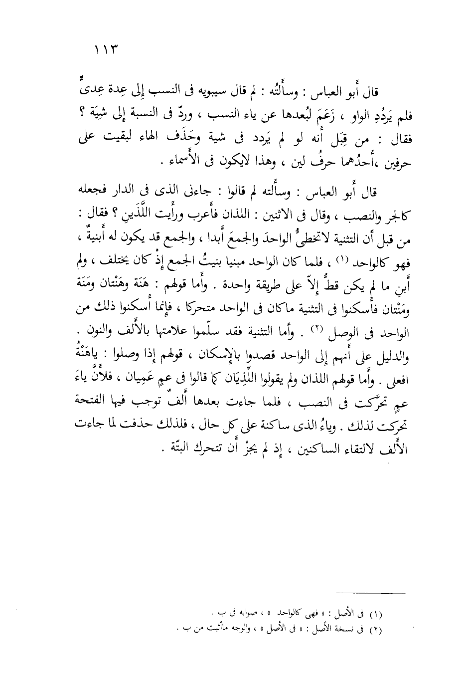 قال أبو العباس: وسألته لم قالوا: جاءني الذي في الدار فجعله كالجر والنصب، وقال في الاثنين: اللذان فأعرب ورأيت اللذين؟ فقال: من قبل أن التثنية لا تخطئ الواحد والجمع أبدا، والجمع قد يكون له أبنيةٌ، فهو كالواحد، فلما كان الواحد مبنيا بنيت الجمع إذ كان يختلف، ولم ابن ما لم يكن قط إلا على طريقة واحدة. وأما قولهم: هنة وهنتان ومنة ومنتان فأسكنوا في التثنية ما كان في الواحد متحركا، فإنما أسكنوا ذلك من الواحد في الوصل. وأما التثنية فقد سلموا علامتها بالألف والنون. والدليل على أنهم إلى الواحد قصدوا بالإسكان، قولهم إذا وصلوا: ياهنة افعلي. وأما قولهم اللذان ولم يقولوا اللذيان كما قالوا في عمٍ عميان، فلأن ياء عم تحركت في النصب، فلما جاءت بعدها ألفٌ توجب فيها الفتحة تحركت لذلك. وياء الذي ساكنة على كل حال، فلذلك حذفت لما جاءت الألف لالتقاء الساكنين، إذ لم يجز أن تتحرك البتة.