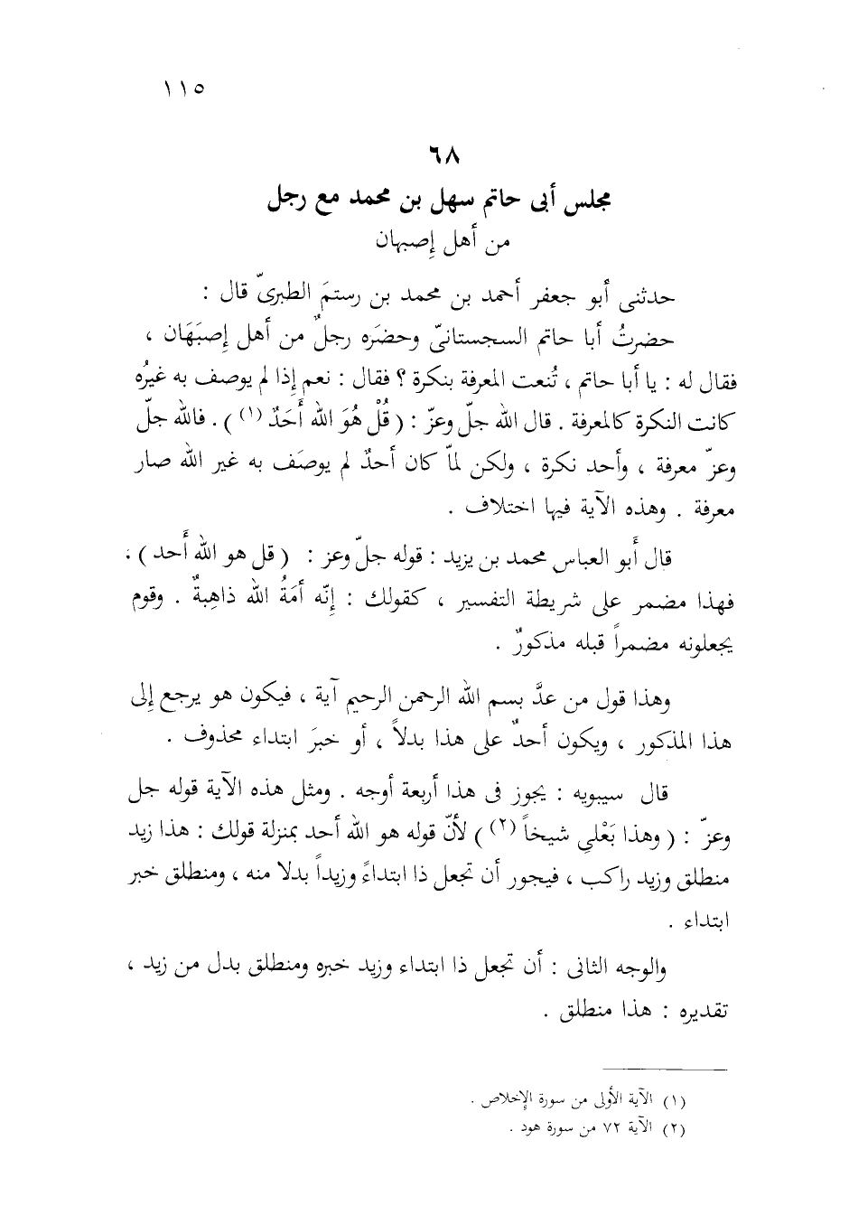 حضرت أبا حاتم السجستاني وحضره رجلٌ من أهل إصبهان، فقال له: يا أبا حاتم، تنعت المعرفة بنكرة؟ فقال: نعم إذا لم يوصف به غيره كانت النكرة كالمعرفة. قال الله جل وعز: {قُلْ هُوَ اللَّهُ أحدٌ} . فالله جل وعز معرفة، وأحد نكرة، ولكن لما كان أحدٌ لم يوصف به غير الله صار معرفة. وهذه الآية فيها اختلاف.