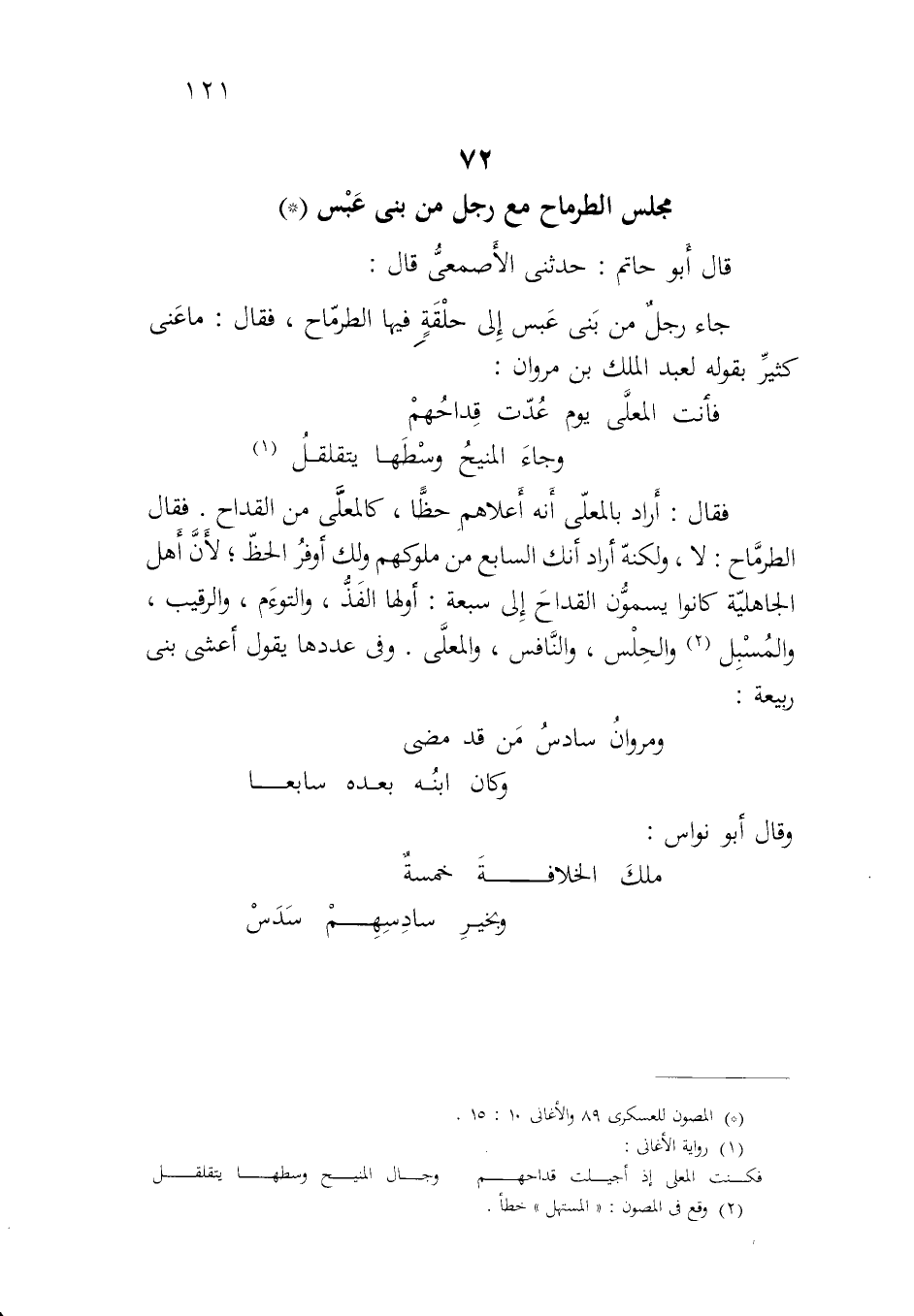فقال: أراد بالمعلى أنه أعلاهم حظا، كالمعلى من القداح. فقال الطرماح: لا، ولكنه أراد أنك السابع من ملوكهم ولك أوفر الحظ؛ لأن أهل الجاهلية كانوا يسمون القداح إلى سبعة: أولها الفذ، والتوءم، والرقيب، والمسبل والحلس، والنافس، والمعلى. وفي عددها يقول أعشى بني ربيعة: