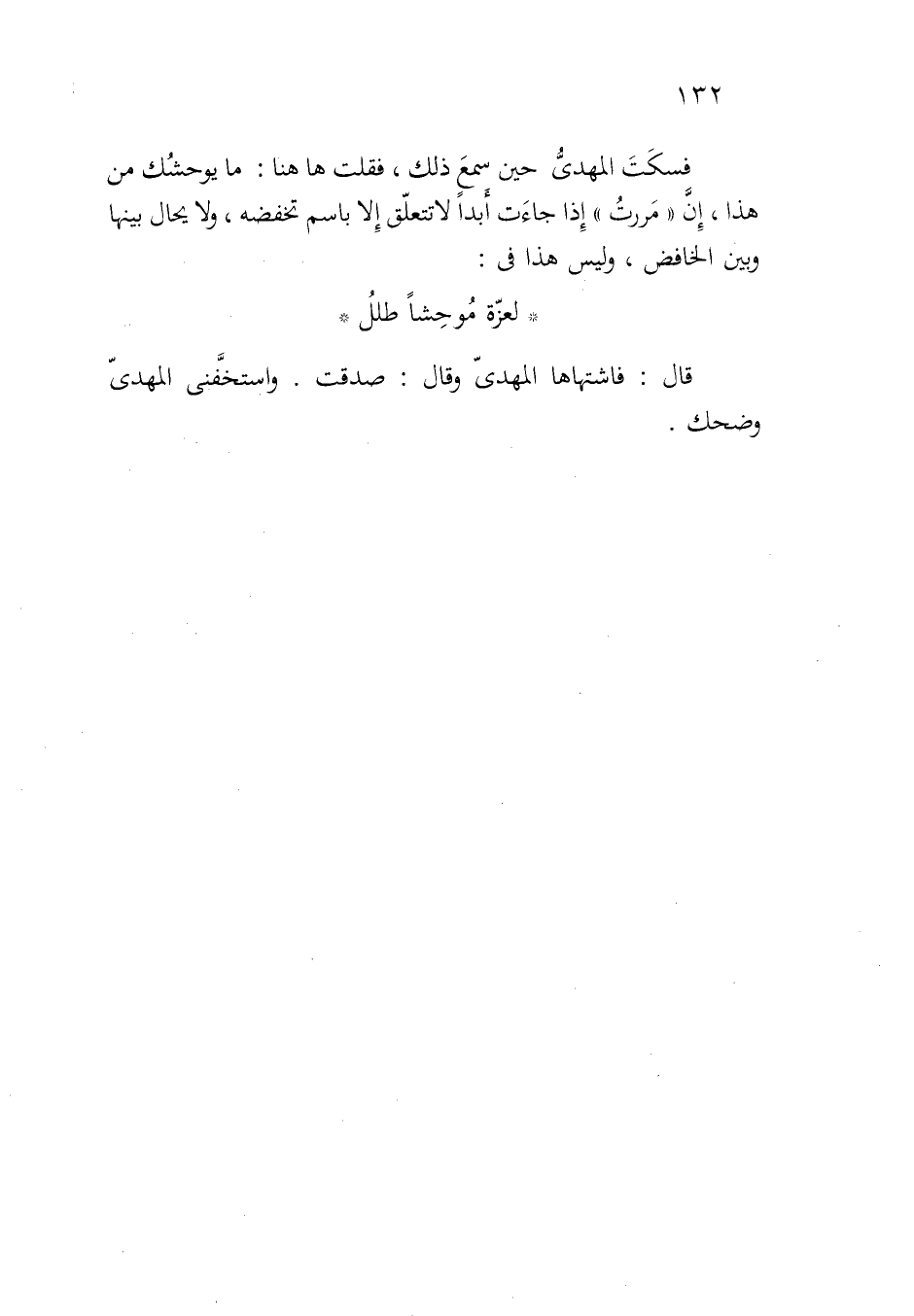فسكت المهدي حين سمع ذلك، فقلت ها هنا: ما يوحشك من هذا، إن ((مررت)) إذا جاءت أبدا لا تتعلق إلا باسم تخفضه، ولا يحال بينها وبين الخافض، وليس هذا في: