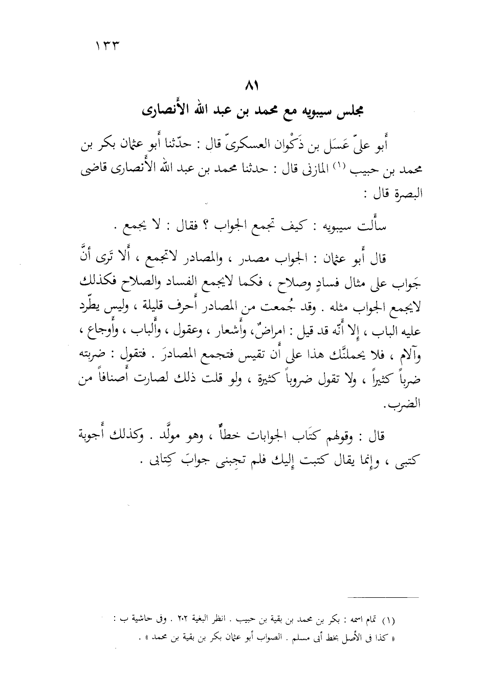 أبو علي عسل بن ذكوان العسكري قال: حدثنا أبو عثمان بكر بن محمد بن حبيب المازني قال: حدثنا محمد بن عبد الله الأنصاري قاضي البصرة قال: