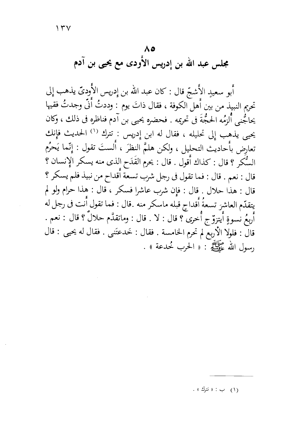 أبو سعيد الأشج قال: كان عبد الله بن إدريس الأودي يذهب إلى تحريم النبيذ من بين أهل الكوفة، فقال ذات يوم: وددت أني وجدت فقيها يحاجني ألزمه الحجة في تحريمه. فحضره يحيى بن آدم فناظره في ذلك، وكان يحيى يذهب إلى تحليله، فقال له ابن إدريس: تترك الحديث فإنك تعارض بأحاديث التحليل، ولكن هلم النظر، ألست تقول: إنما يحرم السكر؟ قال: كذاك أقول. قال: يحرم القدح الذي منه يسكر الإنسان؟ قال: نعم. قال: فما تقول في رجل شرب تسعة أقداح من نبيذ فلم يسكر؟ قال: هذا حلال. قال: فإن شرب عاشرا فسكر، قال: هذا حرام ولو لم يتقدم العاشر تسعة أقداح قبله ما سكر منه. قال: فما تقول أنت في رجل له أربع نسوةٍ أيتزوج أخرى؟ قال: لا. قال: وما تقدم حلال؟ قال: نعم. قال: فلولا الأربع لم تحرم الخامسة. فقال: خدعتني. فقال له يحيى: قال رسول الله صلى الله عليه وسلم: ((الحرب خدعة)) .