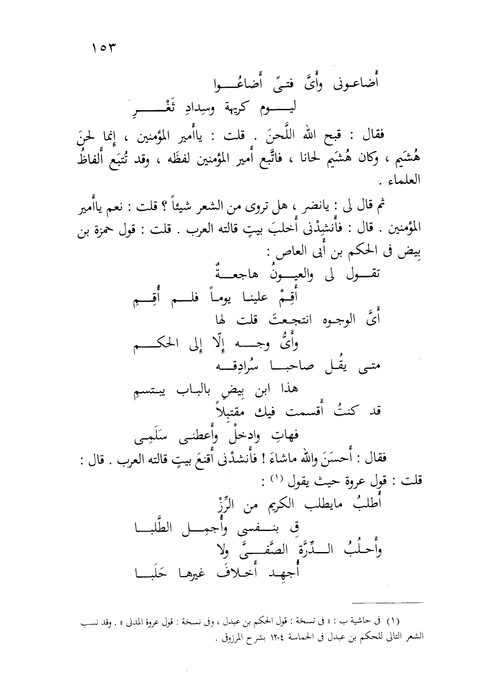 فقال: أحسن والله ما شاء! فأنشدني أقنع بيتٍ قالته العرب. قال: قلت: قول عروة حيث يقول: