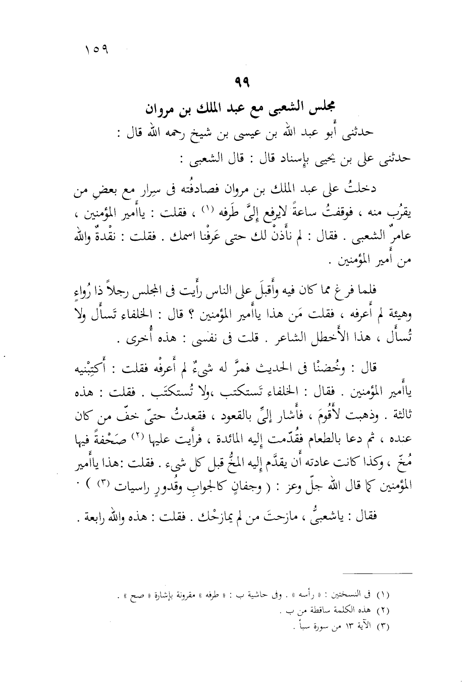قال: وخضنا في الحديث فمر له شيءٌ لم أعرفه فقلت: أكتبنيه يا أمير المؤمنين. فقال: الخلفاء تستكتب ولا تستكتب. فقلت: هذه ثالثة. وذهبت لأقوم، فأشار إلي بالقعود، فقعدت حتى خف من كان عنده، ثم دعا بالطعام فقدمت إليه المائدة، فرأيت عليها صحفة فيها مخ، وكذا كانت عادته أن يقدم إليه المخ قبل كل شيء. فقلت: هذا يا أمير المؤمنين كما قال الله جل وعز: {وجفانٍ كَالْجَوَابِ وقدورٍ راسيات} .