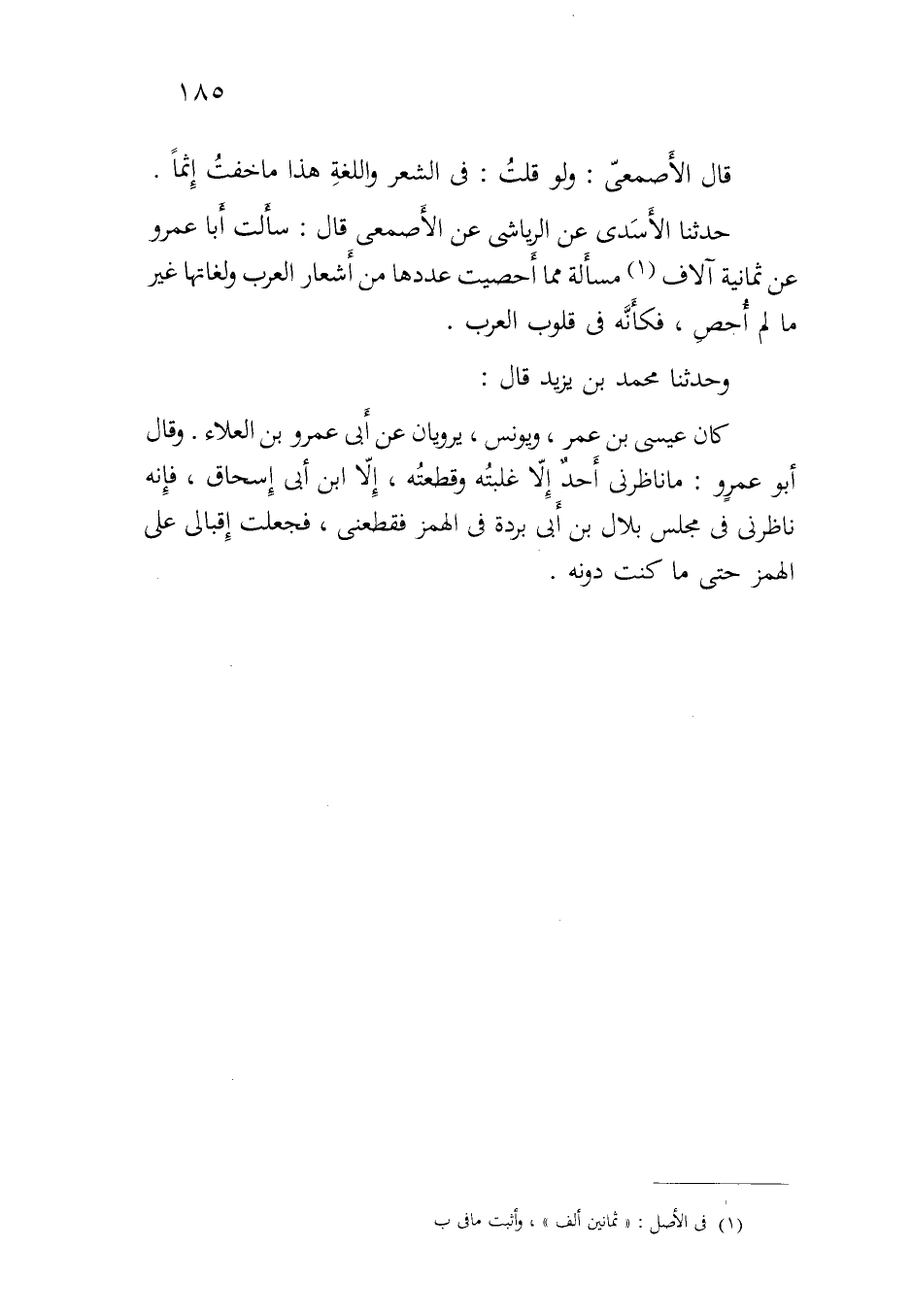 حدثنا الأسدي عن الرياشي عن الأصمعي قال: سألت أبا عمرو عن ثمانية آلاف مسألة مما أحصيت عددها من أشعار العرب ولغاتها غير ما لم أحص، فكأنه قي قلوب العرب.