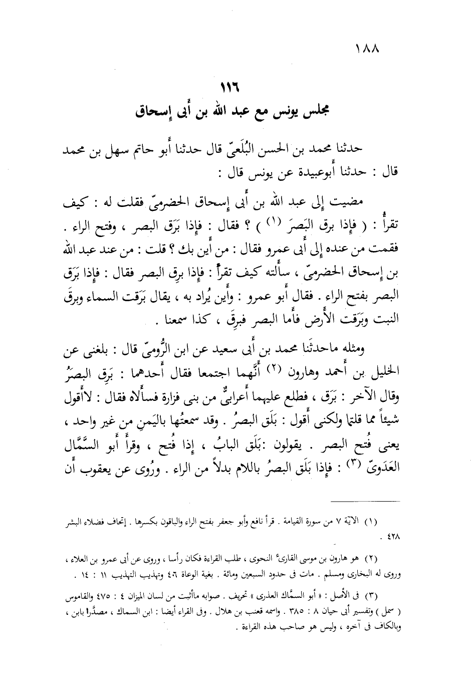 مضيت إلى عبد الله بن أبي إسحاق الحضرمي فقلت له: كيف تقرأ: {فَإِذَا بَرِقَ الْبَصَرُ} ؟ فقال: فإذا برق البصر، وفتح الراء. فقمت من عنده إلى أبي عمرو فقال: من أين بك؟ قلت: من عند عبد الله بن [أبي] إسحاق الحضرمي، سألته كيف تقرأ: فإذا برق البصر فقال: فإذا برق البصر بفتح الراء. فقال أبو عمرو: وأين يراد به، يقال برقت السماء وبرق النبت وبرقت الأرض فأما البصر فبرق، كذا سمعنا.