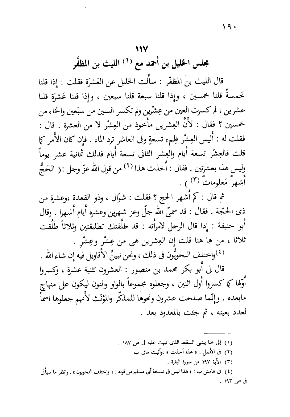 قال الليث بن المظفر: سألت الخليل عن العشرة فقلت: إذا قلنا خمسة قلنا خمسين، وإذا قلنا سبعة قلنا سبعين، وإذا قلنا عشرة قلنا عشرين، لم كسرت العين من عشرين ولم تكسر السين من سبعين والخاء من خمسين؟ فقال: لأن العشرين مأخوذ من العشر لا من العشرة. قال: فقلت له: أليس العشر ظمء تسعةٍ وفي العاشر ترد الماء. فإن كان الأمر كما قلت فالعشر تسعة أيام والعشر الثاني تسعة أيام فذلك ثمانية عشر يوما وليس هذا بعشرتين. فقال: أخذت هذا من قول الله عز وجل: {الحج أشهرٌ معلوماتٌ} .