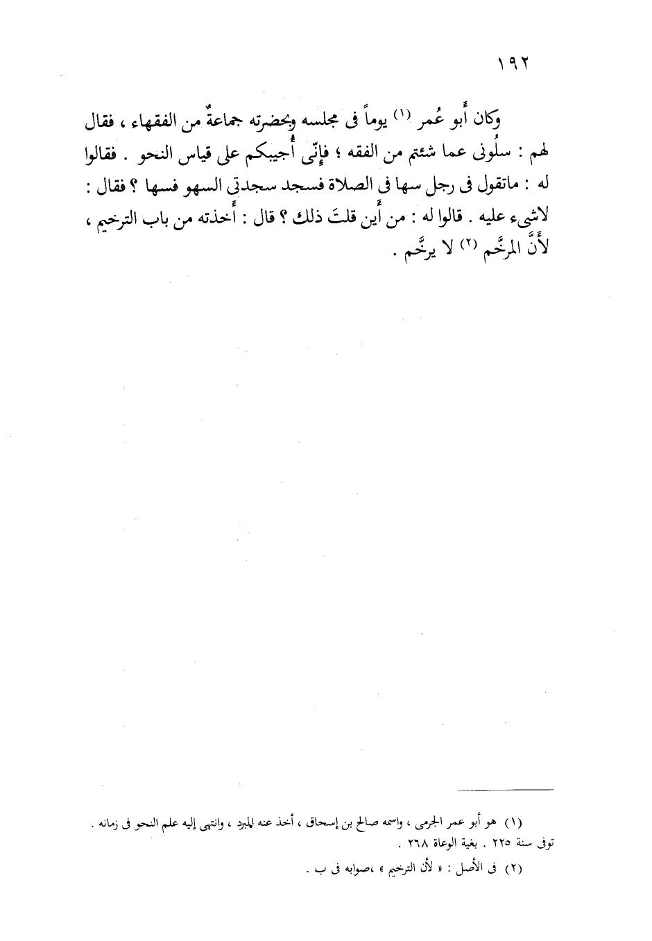وكان أبو عمر يوما في مجلسه وبحضرته جماعةٌ من الفقهاء، فقال لهم: سلوني عما شئتم من الفقه؛ فإني أجيبكم على قياس النحو. فقالوا له: ما تقول في رجل سها في الصلاة فسجد سجدتي السهو فسها؟ فقال: لا شيء عليه. قالوا له: من أين قلت ذلك؟ قال: أخذته من باب الترخيم، لأن المرخم لا يرخم.