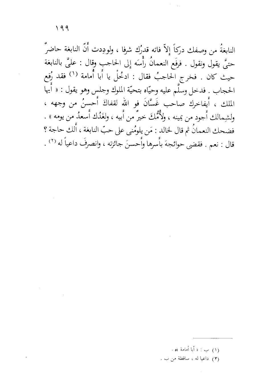 النابغة من وصفك دركا إلا فاته قدرك شرفا، ولوددت أن النابغة حاضرٌ حتى يقول ونقول. فرفع النعمان رأسه إلى الحاجب وقال: علي بالنابغة حيث كان. فخرج الحاجب فقال: ادخل يا أبا أمامة فقد رفع الحجاب. فدخل وسلم عليه وحياه بتحية الملوك وجلس وهو يقول: ((أيها الملك، أيفاخرك صاحب غسان فوالله لقفاك أحسن من وجهه، ولشمالك أجود من يمينه، ولأمك خيرٌ من أبيه، ولغدك أسعد من يومه)) . فضحك النعمان ثم قال لخالد: من يلومني على حب النابغة، ألك حاجة؟ قال: نعم. فقضى حوائجه بأسرها وأحسن جائزته، وانصرف داعيا له.