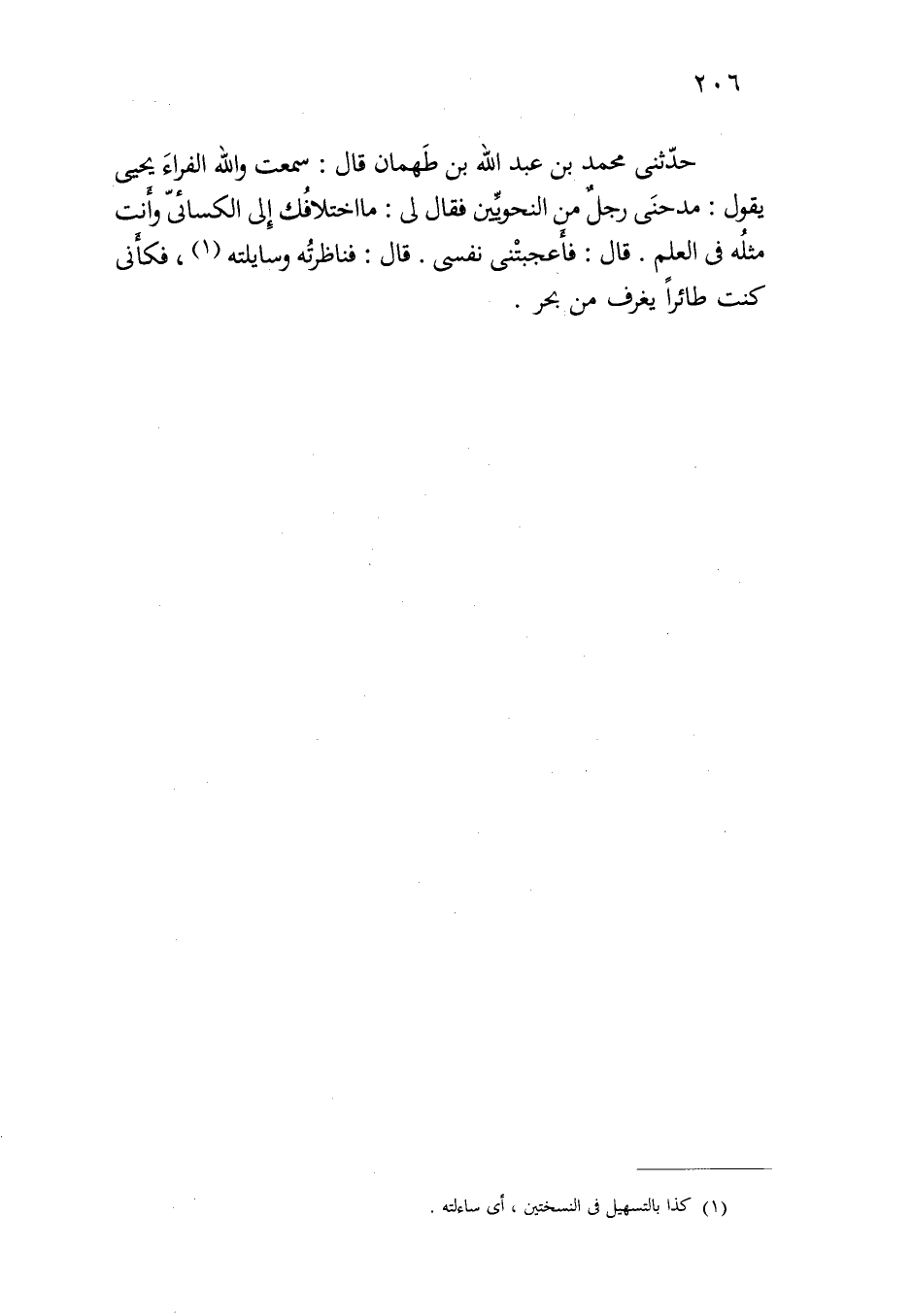 حدثني محمد بن عبد الله بن طهمان قال: سمعت والله الفراء يحيى يقول: مدحني رجلٌ من النحويين فقال لي: ما اختلافك إلى الكسائي وأنت مثله في العلم. قال: فأعجبتني نفسي. قال: فناظرته وسايلته، فكأني كنت طائرا يغرف من بحر.