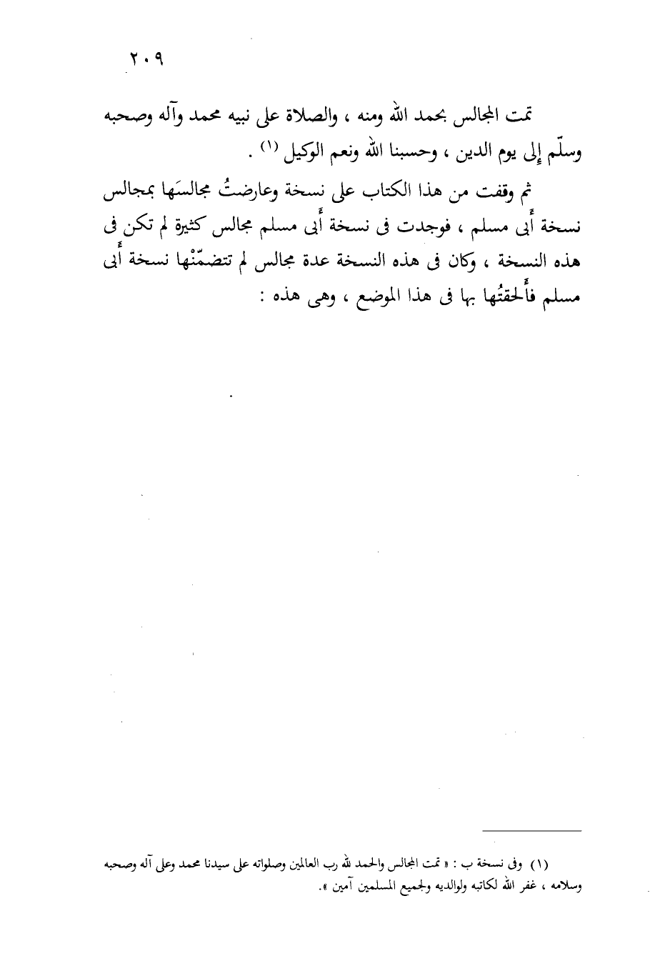ثم وقفت من هذا الكتاب على نسخة وعارضت مجالسها بمجالس نسخة أبي مسلم، فوجدت في نسخة أبي مسلم مجالس كثيرة لم تكن في هذه النسخة، وكان في هذه النسخة عدة مجالس لم تتضمنها نسخة أبي مسلم فألحقتها بها في هذا الموضع، وهي هذه: