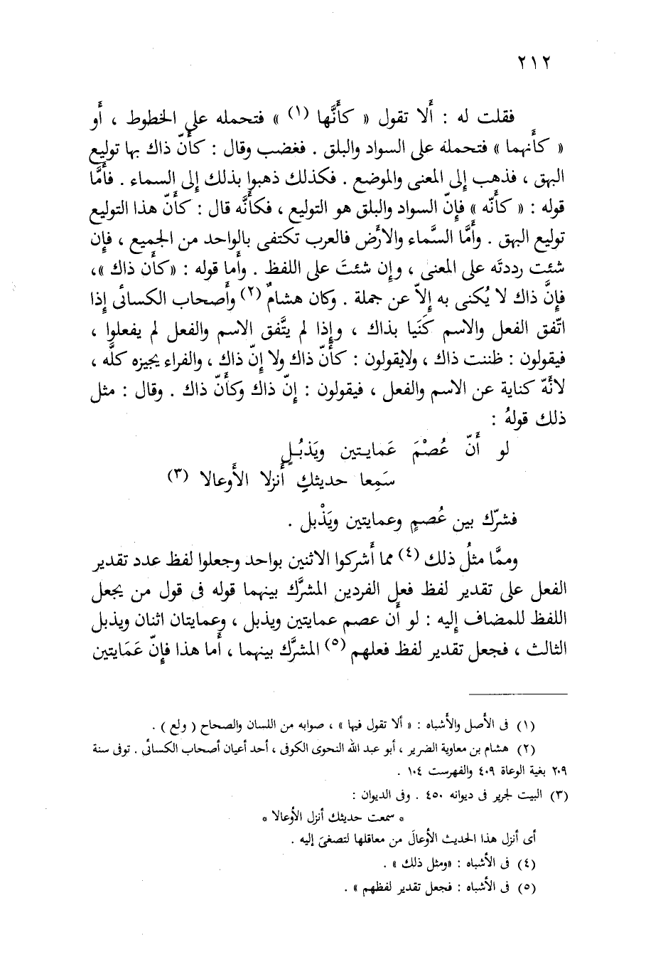 ومما مثل ذلك مما أشركوا الاثنين بواحد وجعلوا لفظ عدد تقدير الفعل على تقدير لفظ فعل الفردين المشرك بينهما قوله في قول من يجعل اللفظ للمضاف إليه: لو أن عصم عمايتين ويذبل، وعمايتان اثنان ويذبل الثالث، فجعل تقدير لفظ فعلهم المشرك بينهما، أما هذا فإن عمايتين