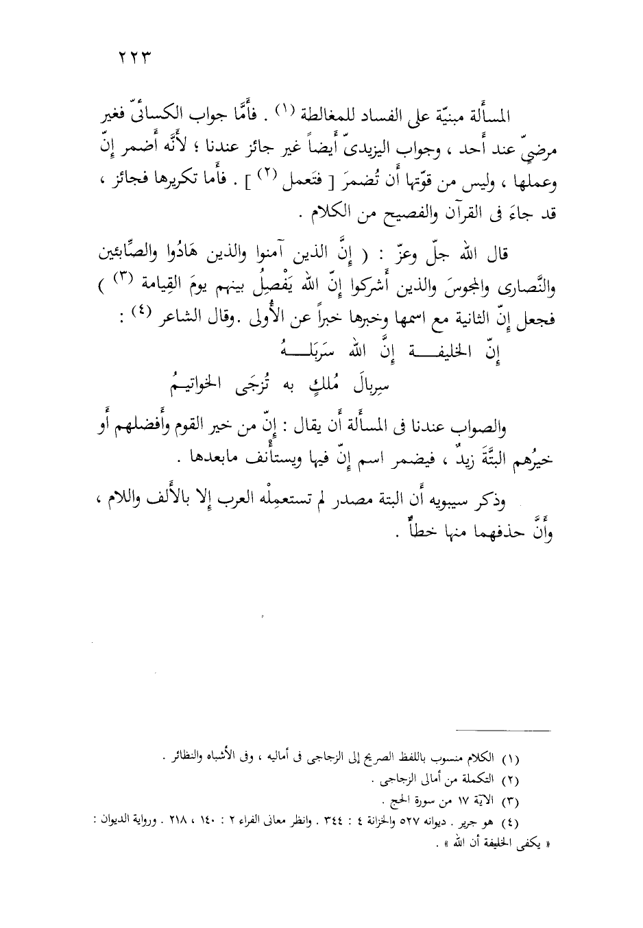 المسألة مبينة على الفساد للمغالطة. فأما جواب الكسائي فغير مرضى عند أحد، وجواب اليزيدي أيضا غير جائز عندنا؛ لأنه أضمر إن وعملها، وليس من قوتها أن تضمر [فتعمل] . فأما تكريرها فجائز. قد جاء في القرآن والفصيح من الكلام.