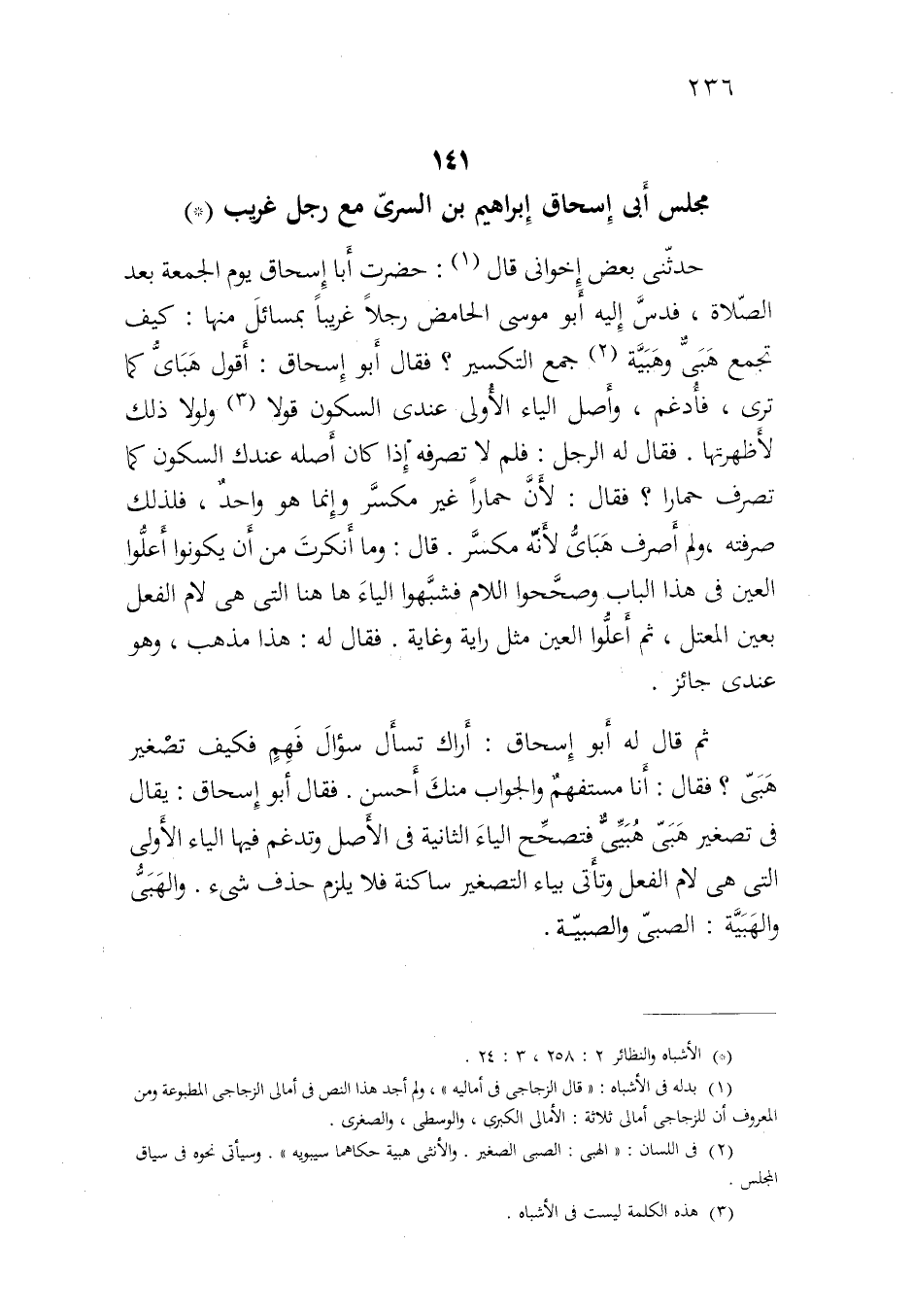 حدثني بعض إخواني قال: حضرت أبا إسحاق يوم الجمعة بعد الصلاة، فدس إليه أبو موسى الحامض رجلا غريبا بمسائل منها: كيف تجمع هبي وهبية جمع التكسير؟ فقال أبو إسحاق: أقول هباي كما ترى، فأدغم، وأصل الياء الأولى عندي السكون قولا ولولا ذلك لأظهرتها. فقال له الرجل: فلم لا تصرفه إذا كان أصله عندك السكون كما تصرف حمارا؟ فقال: لأن حمارا غير مكسر وإنما هو واحدٌ، فلذلك صرفته، ولم أصرف هباي لأنه مكسر. قال: وما أنكرت من أن يكونوا أعلوا العين في هذا الباب وصححوا اللام فشبهوا الياء ها هنا التي هي لام الفعل بعين المعتل، ثم أعلوا العين مثل راية وغاية. فقال له: هذا مذهب، وهو عندي جائز.