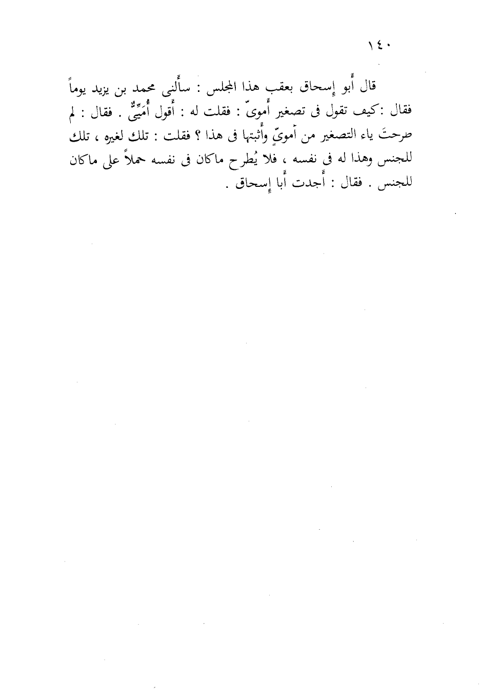قال أبو إسحاق بعقب هذا المجلس: سألني محمد بن يزيد يوما فقال: كيف تقول في تصغير أموي: فقلت له: أقول أميي. فقال: لم صرحت ياء التصغير من أموي وأثبتها في هذا؟ فقلت: تلك لغيره، تلك للجنس وهذا له في نفسه، فلا يطرح ما كان في نفسه حملا على ما كان للجنس. فقال: أجدت أبا إسحاق.