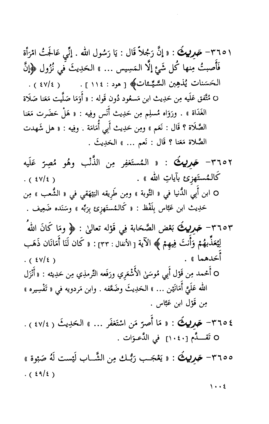 3651 حديث ( إن رجلاً قال يا رسول الله إني عالجت امرأة فصبت منها كل شيء إلا المسيس . . . ) الحديث في نزول ( ^ إن الحسنات يذهبن السيئات ) هود 114 ( 4 / 47 ) (1)