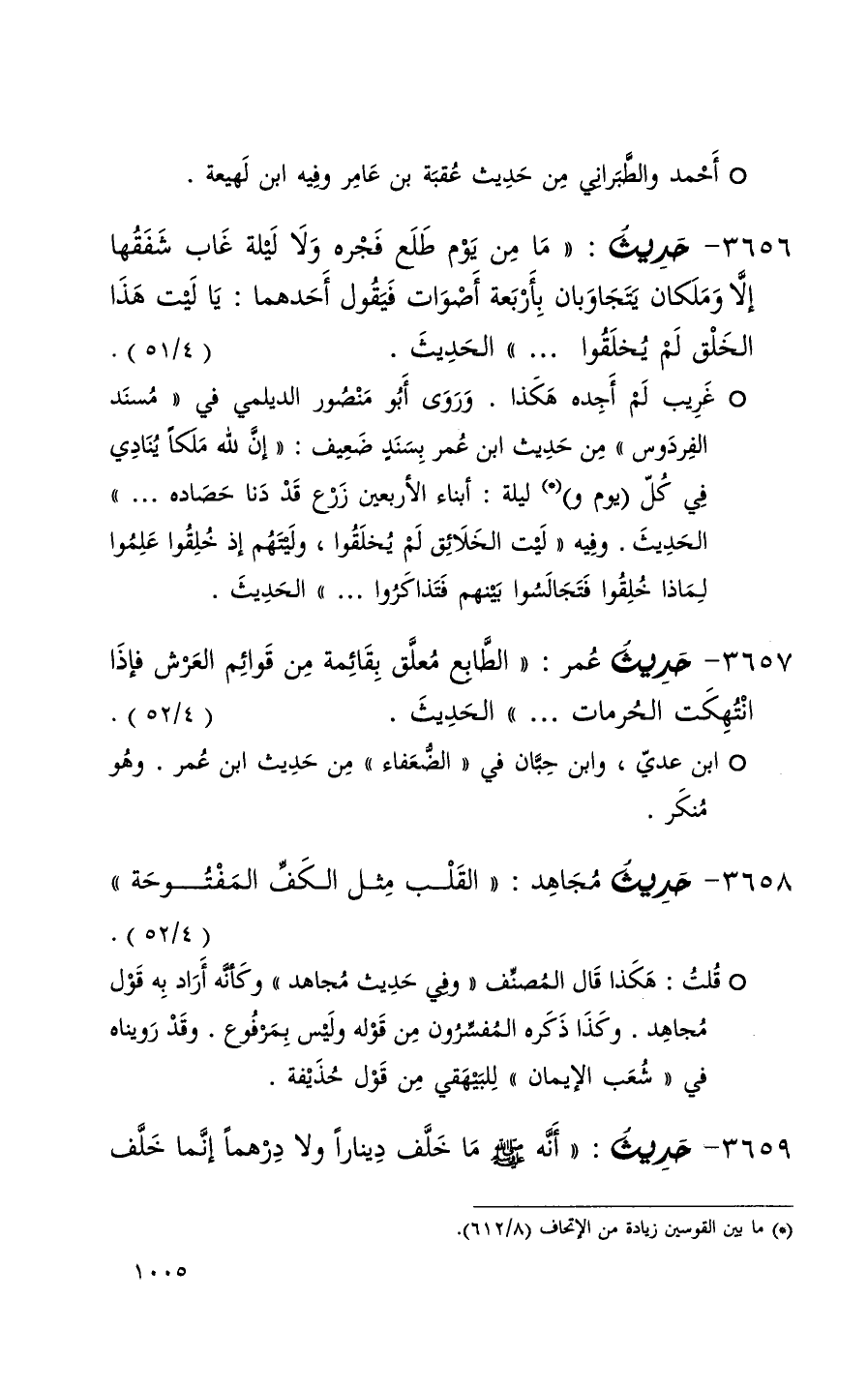 3656 حديث ( ما من يوم طلع فجره ولا ليلة غاب شفقها إلا وملكان يتجاوبان بأربعة أصوات فيقول أحدهما يا ليت هذا الخلق لم يخلقوا . . . ) الحديث ( 4 / 51 )