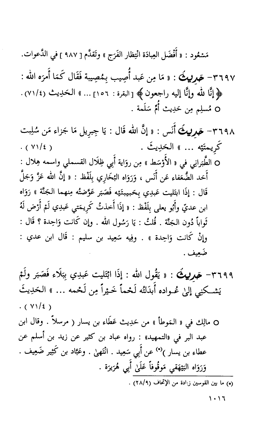 3697 حديث ( ما من عبد أصيب بمصيبة فقال كما أمره الله ( ^ إنا لله وإنا إليه راجعون ) البقر 156 . . . ) الحديث ( 4 / 71 )