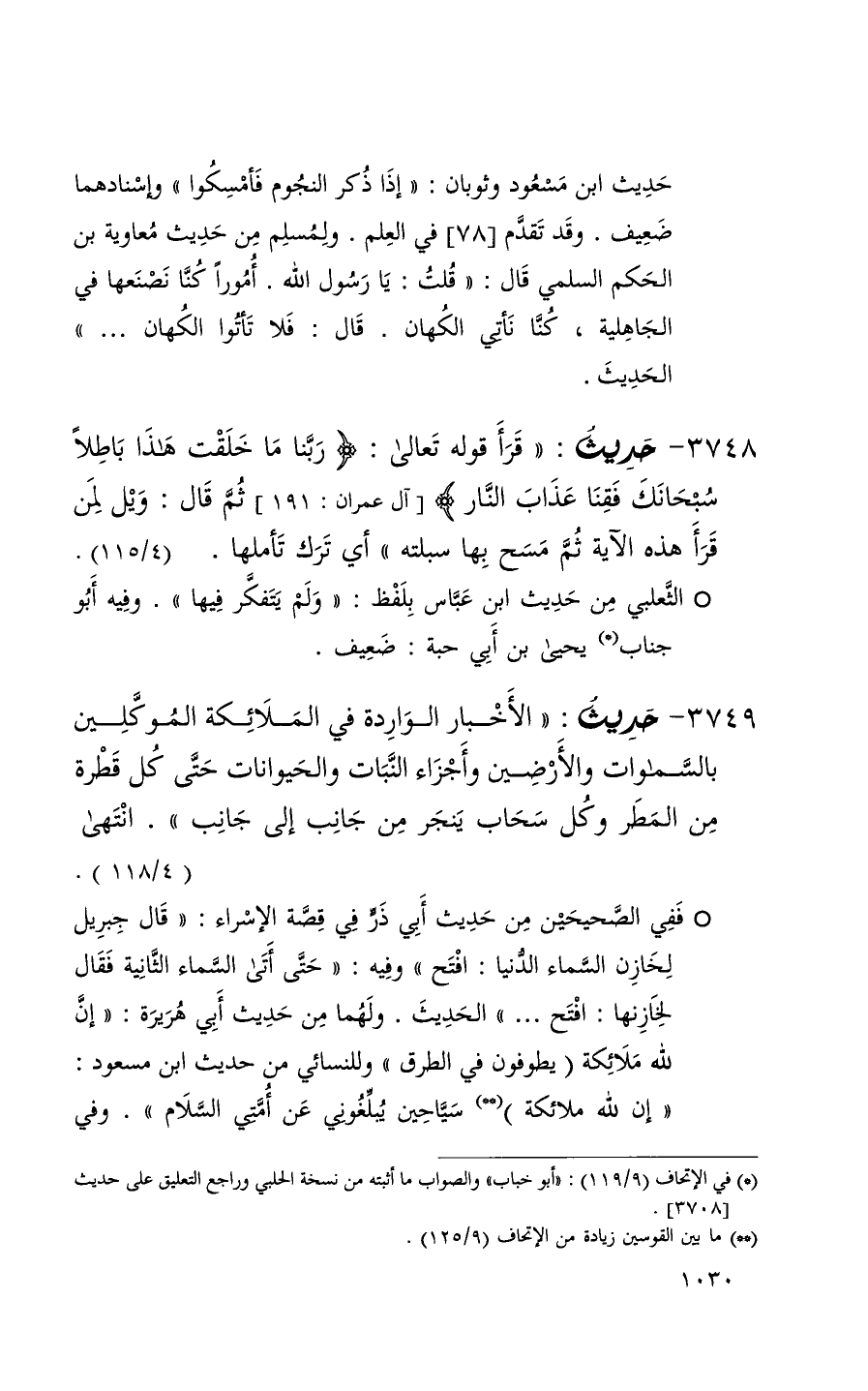 حديث ابن مسعود وثوبان ( إذا ذكر النجوم فأمسكوا ) وإسنادهما ضعيف وقد تقدم 78 في العلم ولمسلم من حديث معاوية بن الحكم السلمي قال قلت يا رسول الله أموراً كنا نصنعها في الجاهلية كنا نأتي الكهان قال فلا تأتوا الكهان . . . ) الحديث (1) الثعلبي من حديث ابن عباس بلفظ ولم يتفكر فيها وفيه أبو جناب يحيى بن أبي حبة ضعيف +