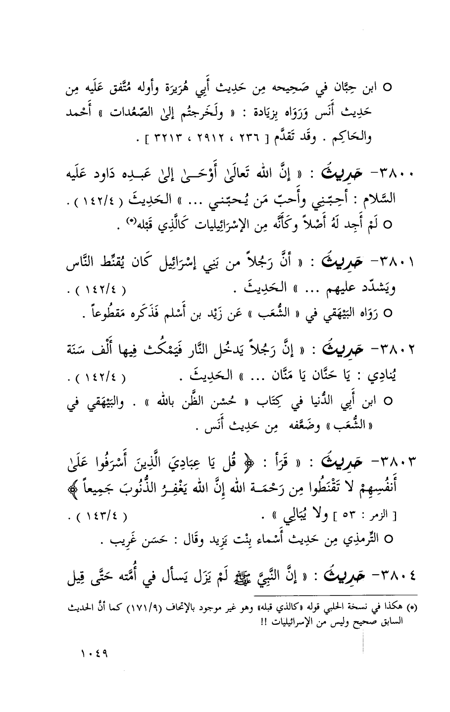 3800 حديث ( إن الله تعالى أوحى إلى عبده داود عليه السلام أحبني وأحب من يحبني . . . ) الحديث ( 4 / 142 ) + لم أجد له أصلاً وكأنه من الإسرائليات كالذي قبله +