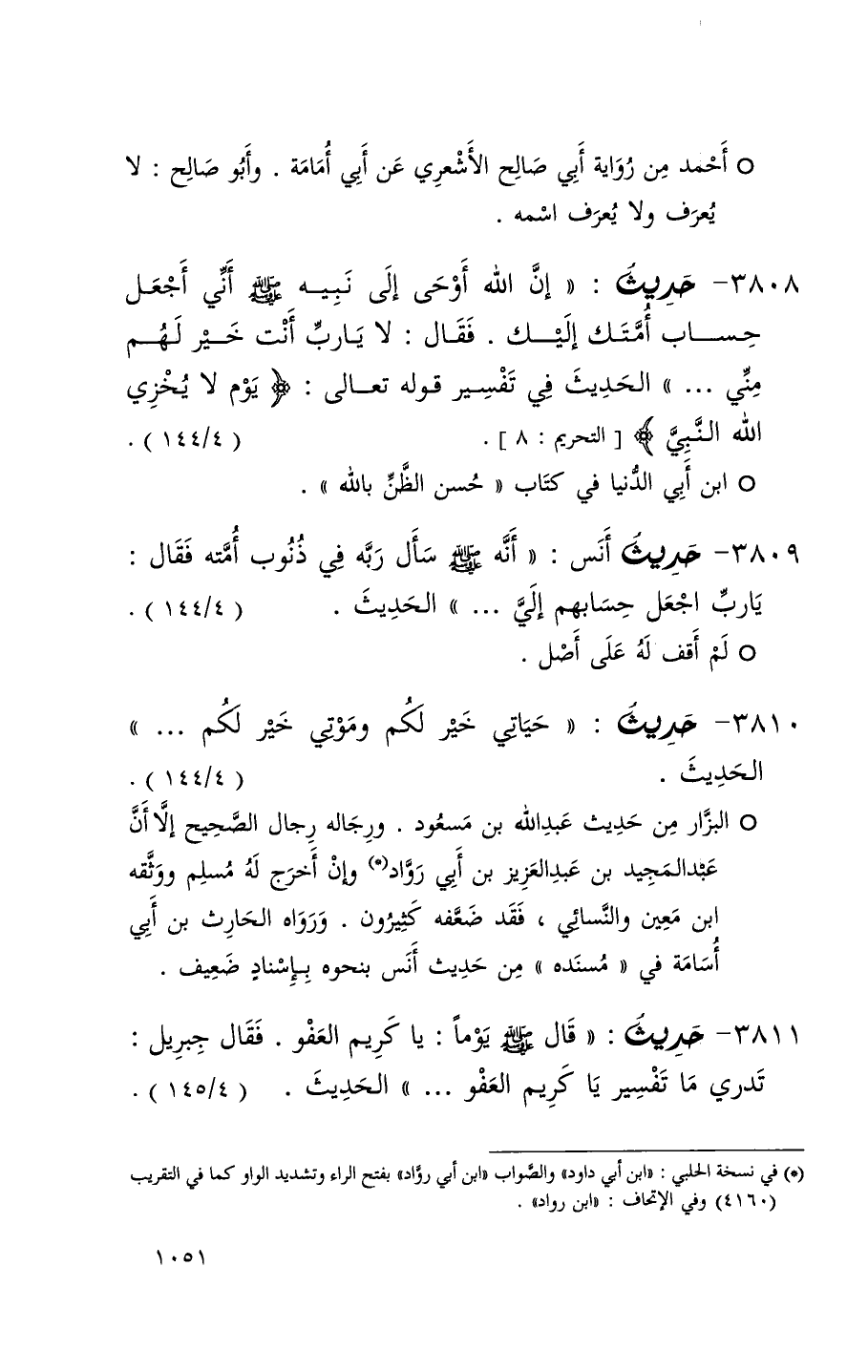 3811 حديث ( قال يوماً يا كريم العفو فقال جبريل تدري ما تفسير يا كريم العفو 000 ) الحديث ( 4 / 145 )