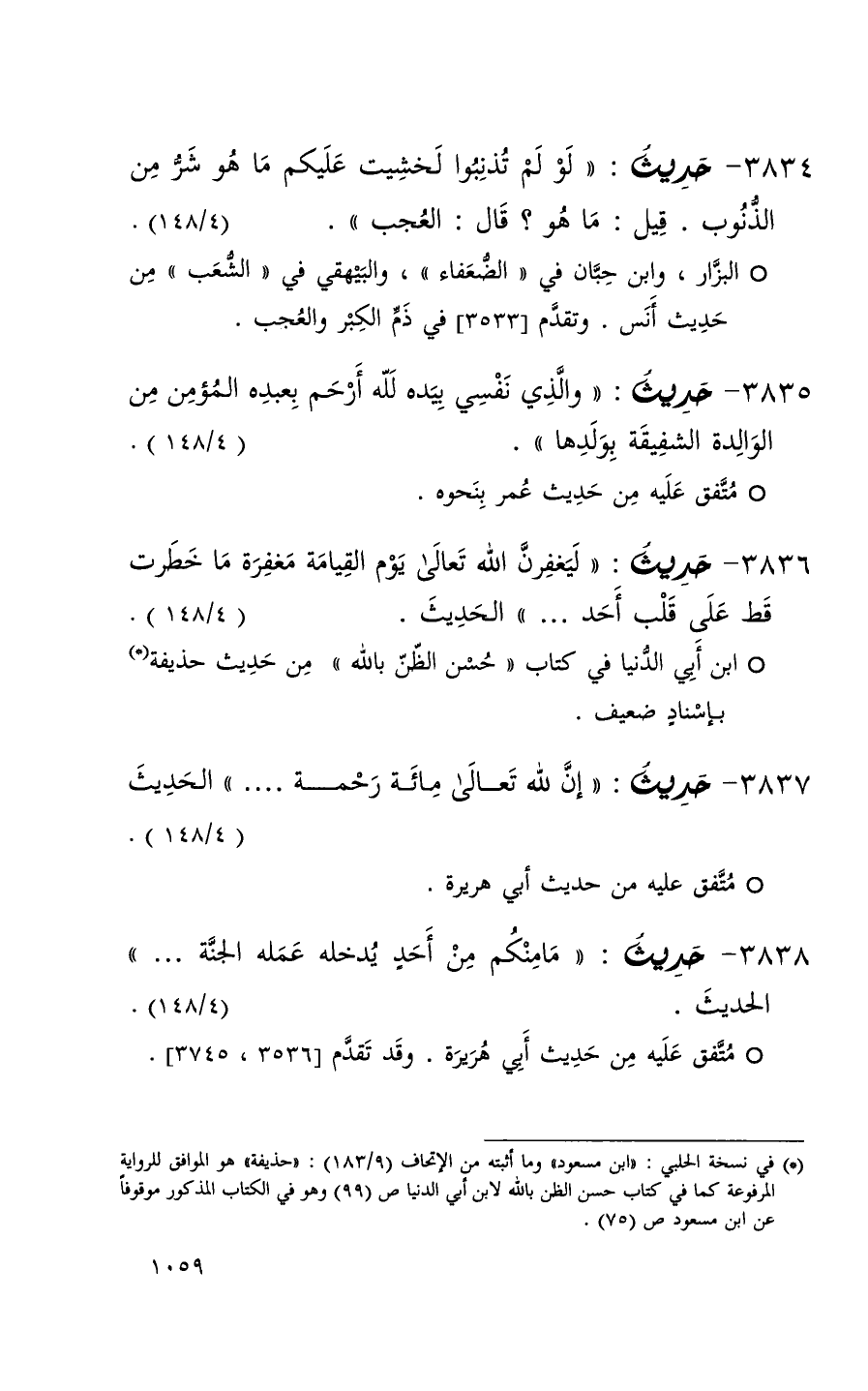 3834 حديث ( لو لم تذنبوا لخشيت عليكم ما هو شر من الذنوب قيل ما هو قال العجب ) ( 4 / 148 ) (1)
