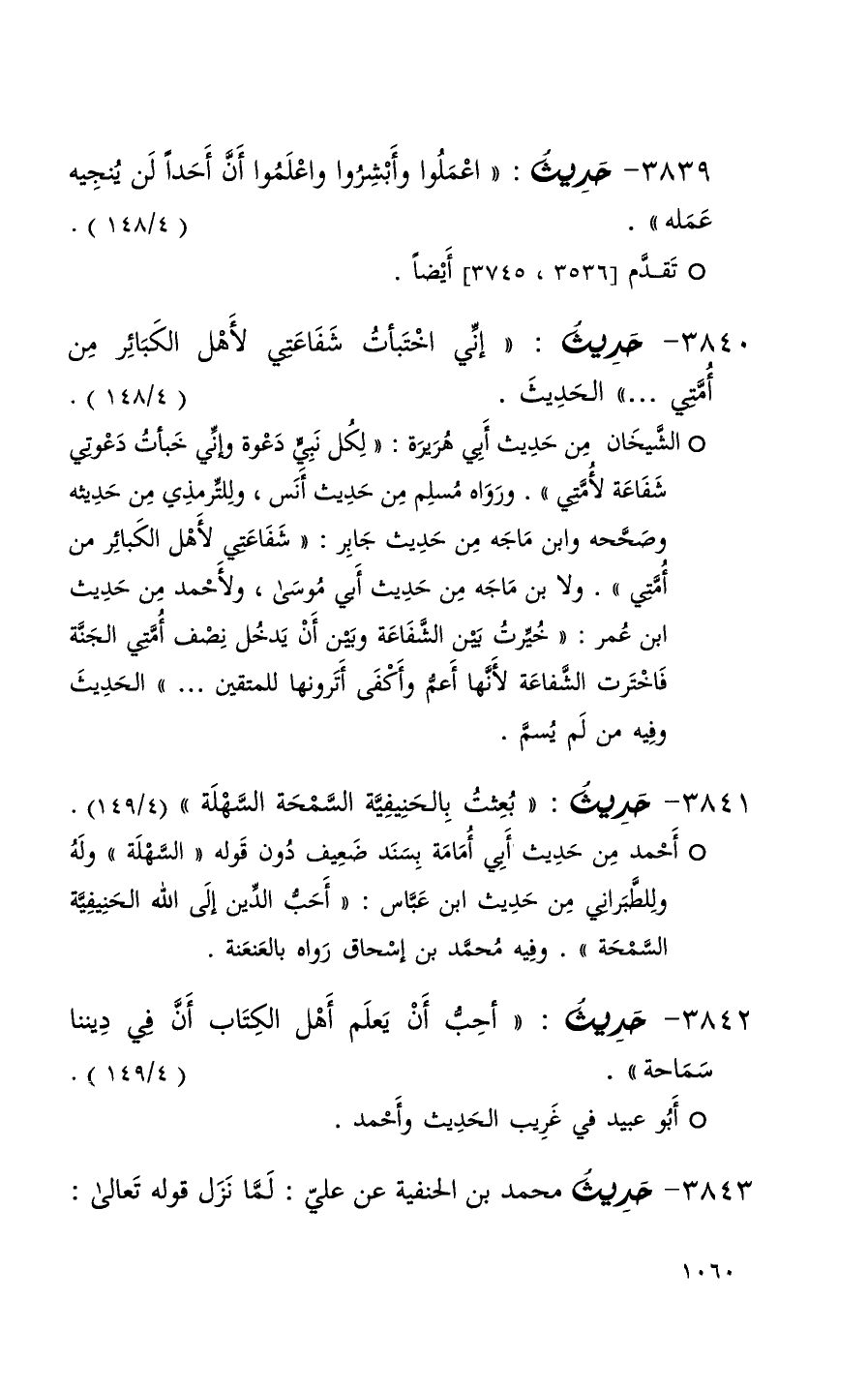 3839 حديث ( اعملوا و أبشروا واعملوا أن أحداُ لن ينجيه عمله ) ( 4 / 148 ) (1)