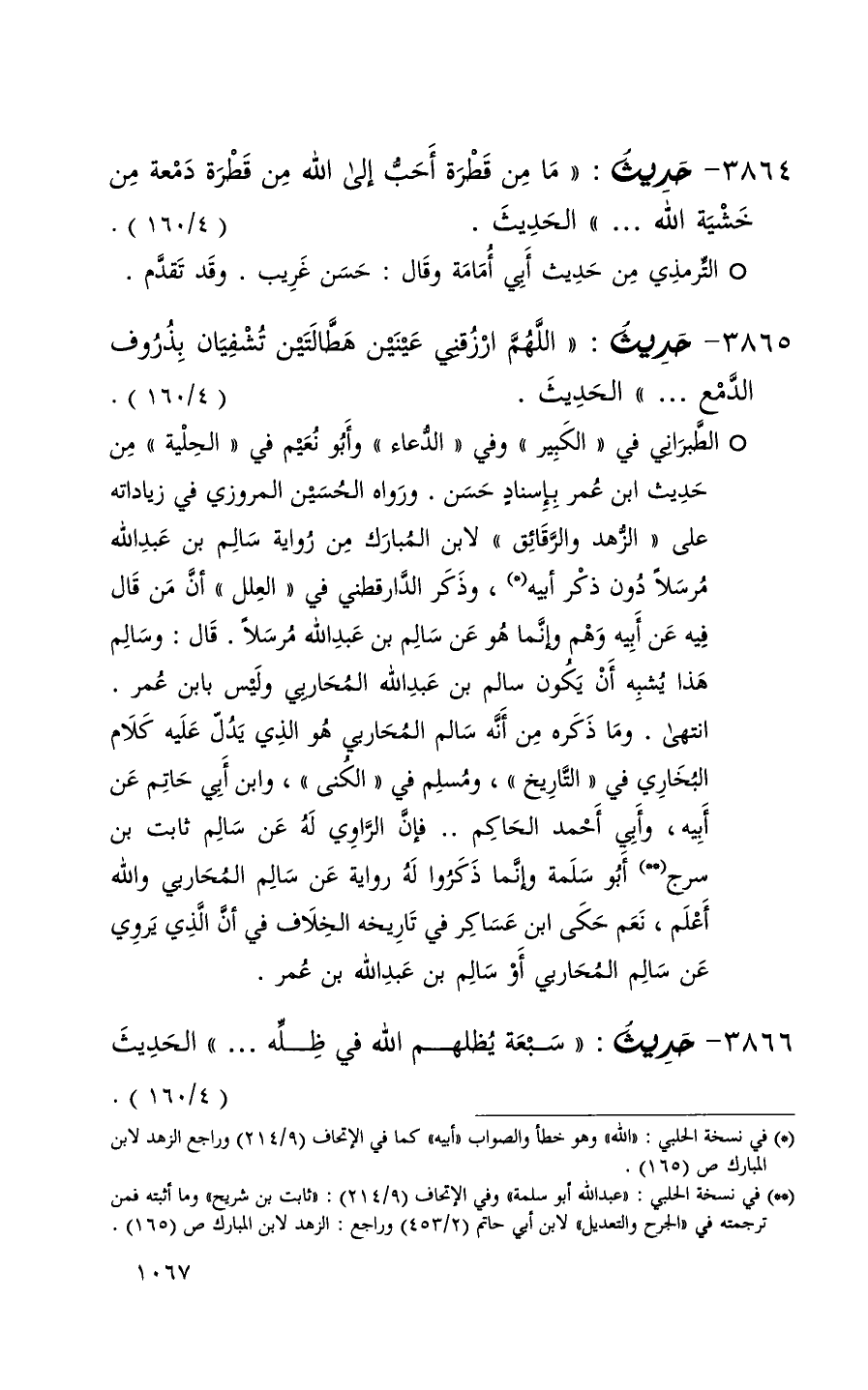 3864 حديث ( ما من قطرة أحب إلى الله من قطرة دمعة من خشية الله 000 ) الحديث ( 4 / 160 ) (1)