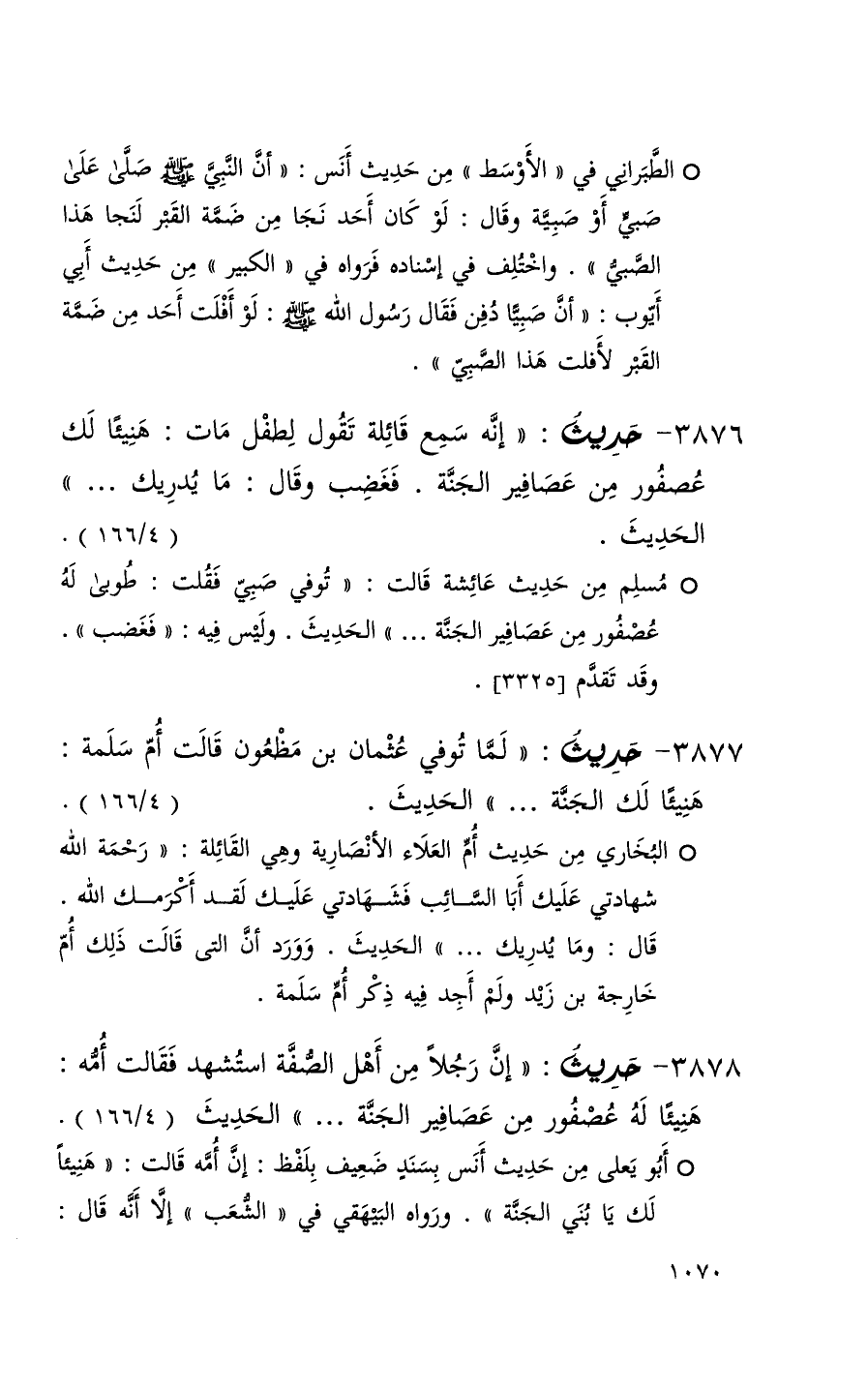 3876 حديث ( إنه سمع قائلة تقول لطفل مات هنيئاً لك عصفور من عصافير الجنة فغضب وقال ما يدريك . . . ) الحديث ( 4 / 166 ) + مسلم من حديث عائشة قالت ( توفي صبي فقلت طوبى له عصفور من عصافير الجنة . . . ) الحديث وليس فيه فغضب وقد تقدم 3325 +