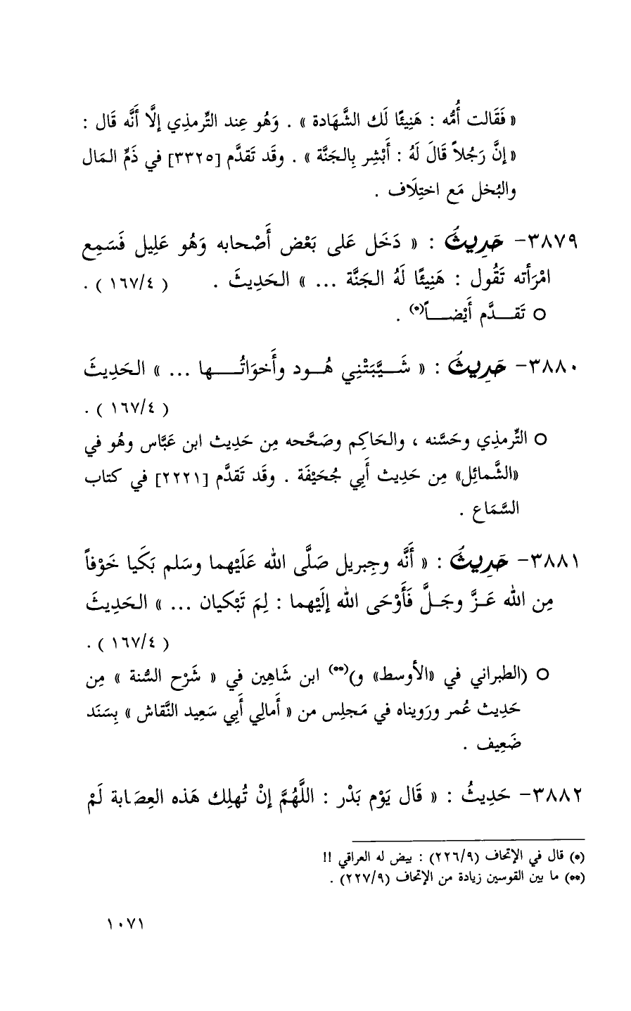 3879 حديث ( دخل على بعض أصحابه وهو عليل فسمع امرأته هنيئاً له الجنة . . . ) الحديث ( 4 / 167 )
