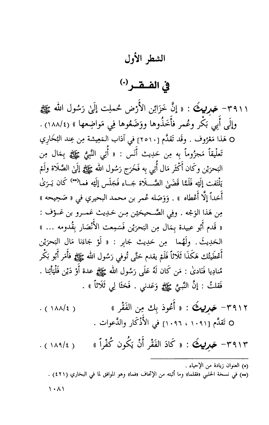 3911 حديث ( إن خزائن الأرض حملت إلى رسول الله وإلى أبي بكر وعمر فأخذوها ووضعوها في مواضعها ) ( 4 / 188 ) (1)
