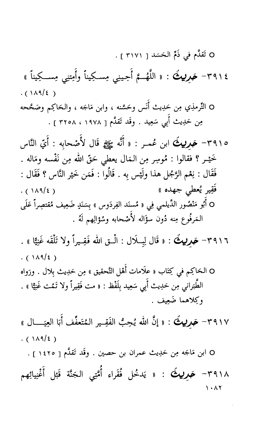 3914 حديث ( اللهم أحيني مسكيناً وأمتني مسكيناً ) ( 4 / 189 ) + الترمذي من حديث أنس وحسنه وابن ماجه والحاكم وصححه من حديث أبي سعيد وقد تقدم 1978ِ 3258 +