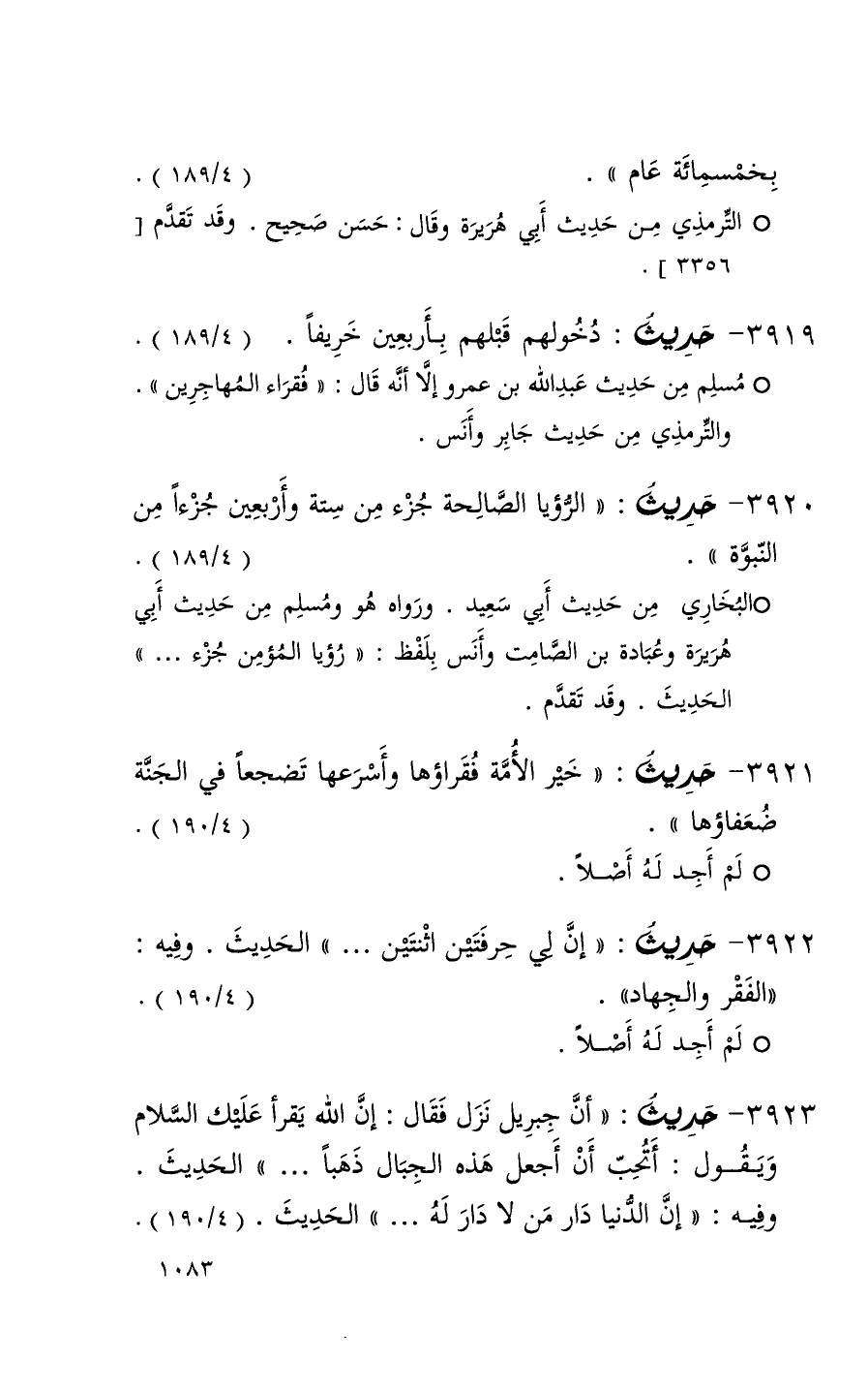 3921 حديث ( خير الأمة فقراؤها وأسرعها تضجعاً في الجنة ضعفاؤها ) ( 4 / 190 ) + لم أجد له أصلاً +
