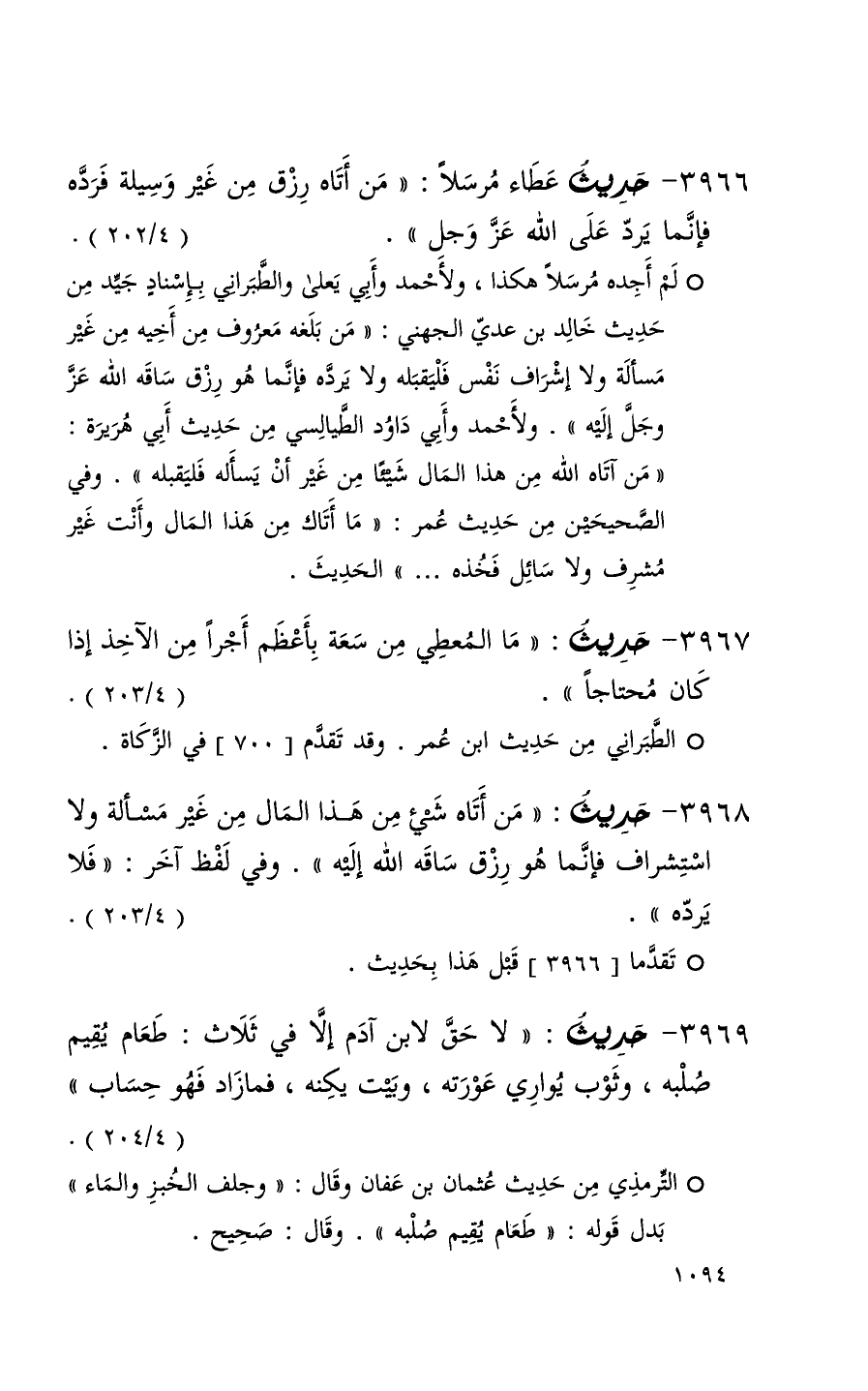 3968 حديث ( من أتاه شيء من هذا المال من غير مسألة ولا استشراف فإنما هو رزق ساقه الله إليه ) وفي لفظ آخر ( فلا يرده ) ( 4 / 203 ) + تقدما 3966 قبل هذا بحديث +
