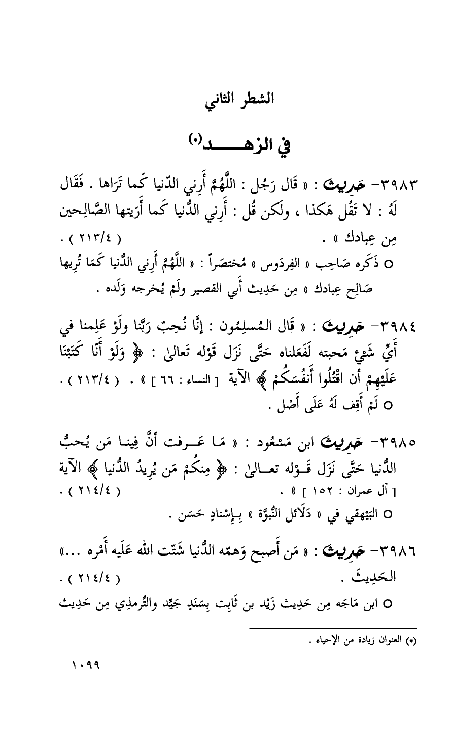 3983 حديث ( قال رجل اللهم أرني الدنيا كما تراها فقال له لا تقل هكذا ولكن قل أرني الدنيا كما أريتها الصالحين من عبادك ) ( 4 / 213 ) (1)