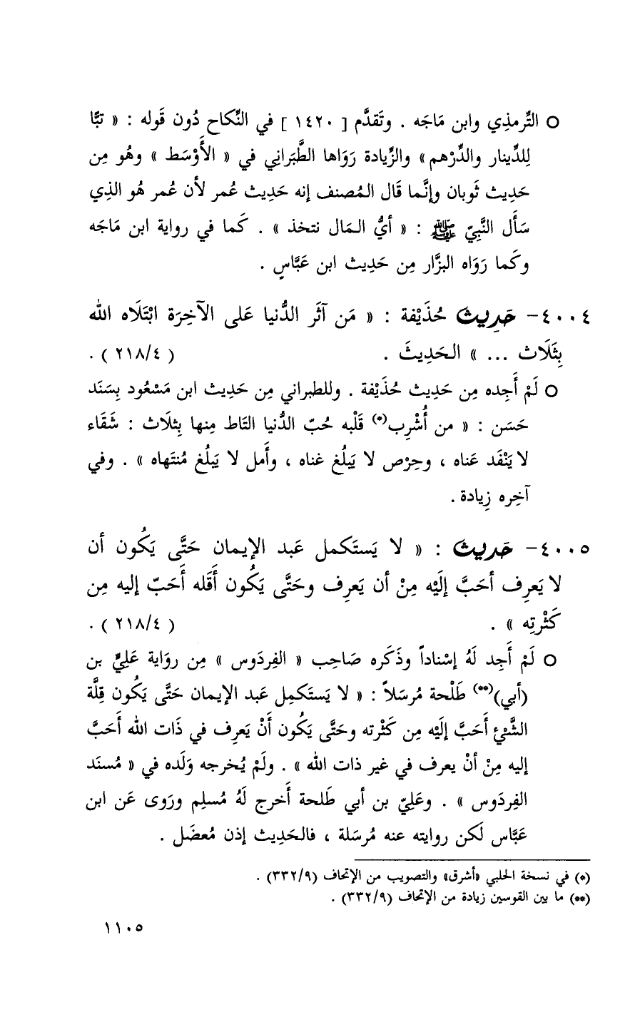 4005 حديث ( لا يستكمل عبد الإيمان حتى يكون أن لا يعرف أحب إليه من أن يعرف وحتى يكون أقله أحب إليه من كثرته ) ( 4 / 218 ) + لم أجد له إسناداً وذكره صاحب الفردوس من رواية علي بن أبي طلحة مرسلاً ( لا يستكمل عبد الإيمان حتى يكون قلة الشيء أحب إليه من كثرته وحتى يكون أن يعرف في ذات الله أحب إليه من أن يعرف في غير ذات الله ) ولم يخرجه ولده في مسند الفردوس وعلي بن أبي طلحة أخرج له مسلم وروى عن ابن عباس لكن روايته عنه مرسلة فالحديث إذن معضل +