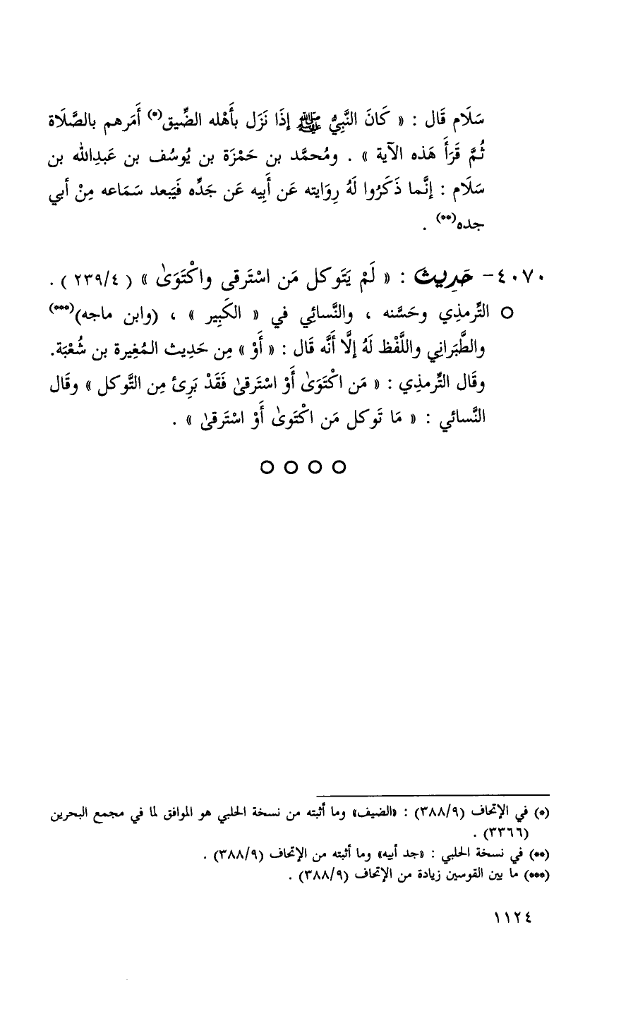 سلام قال ( كان النبي إذا نزل بأهله الضيق أمرهم بالصلاة ثم قرأ هذه الآية ) ومحمد بن حمزة بن يوسف بن عبد الله بن سلام إنما ذكروا له روايته عن أبيه عن جده فيبعد سماعه من أبي جده (1) الترمذي وحسنه والنسائي في الكبير وابن ماجه والطبراني واللفظ له إلا أنه قال أو من حديث المغيرة بن شعبة وقال الترمذي ( من اكتوى أو استرقى فقد برئ من التوكل ) وقال النسائي ( ما توكل من اكتوى أو استرقى )