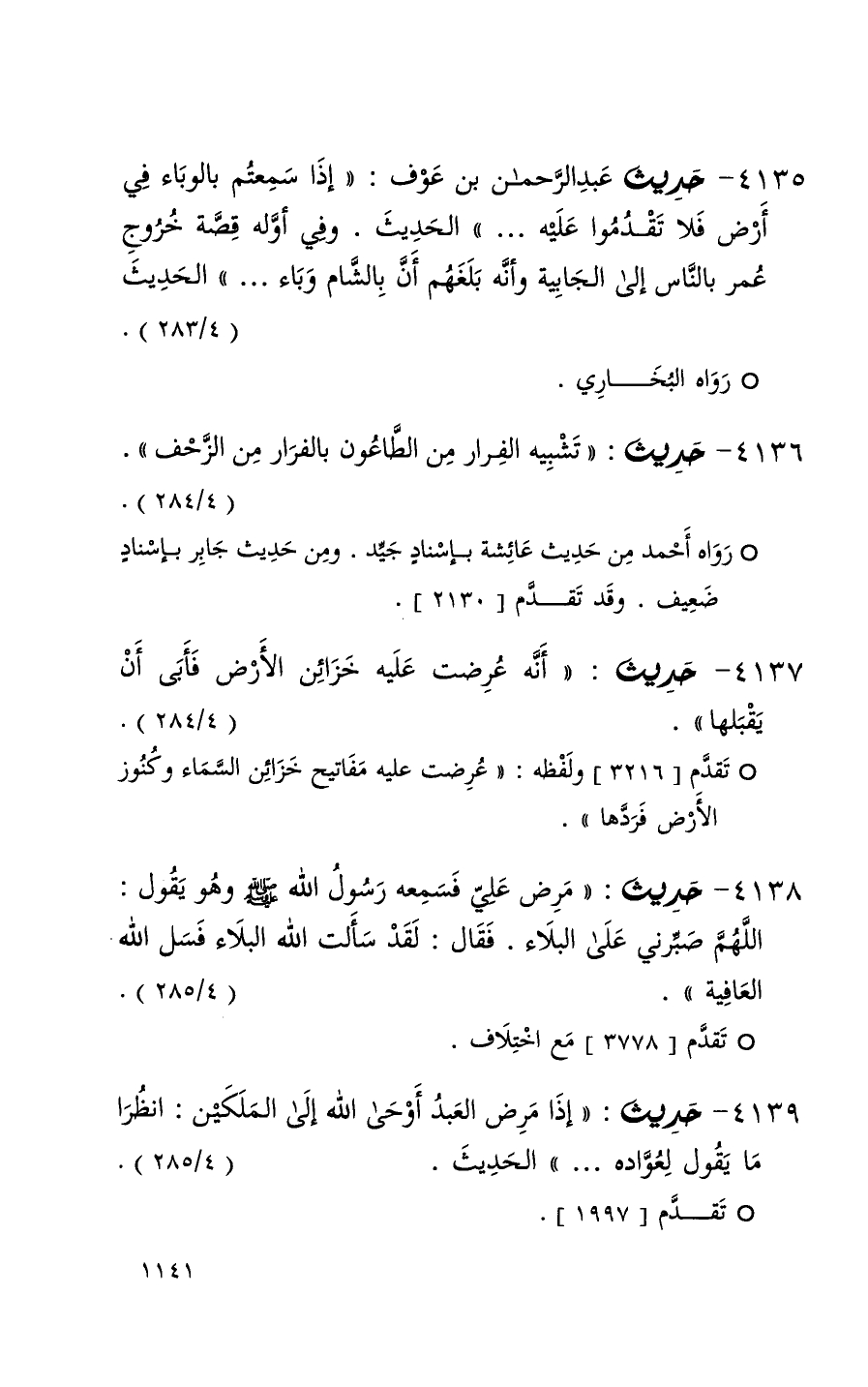 4135 حديث عبد الرحمن بن عوف ( إذا سمعتم بالوباء في أرض فلا تقدموا عليه . . . ) الحديث وفي أوله قصة خروج عمر بالناس إلى الجابية وأنه بلغهم أن بالشام وباء . . . ) الحديث ( 4 / 283 ) (1)