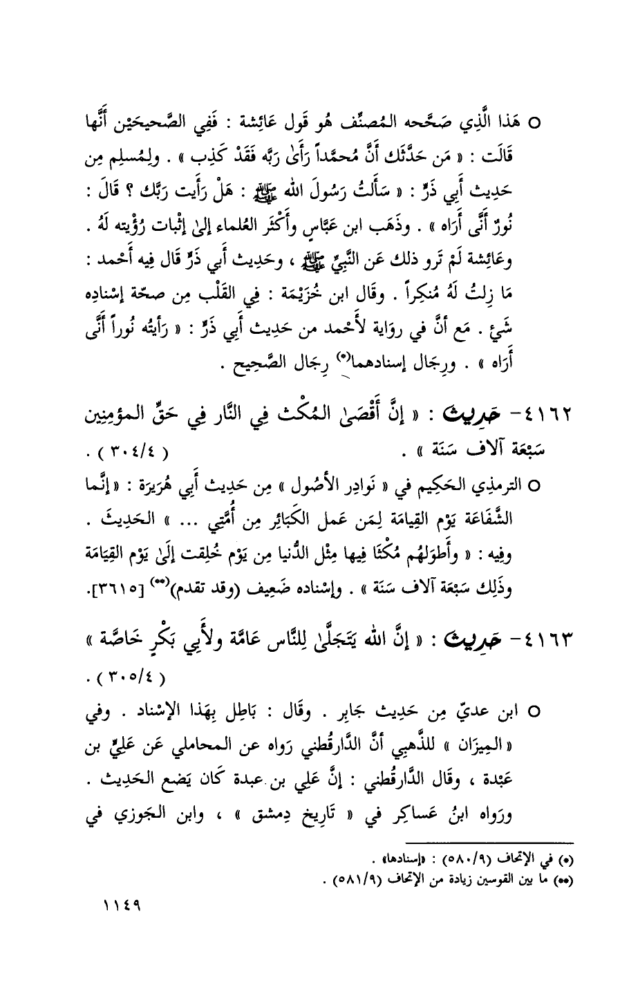 1- هذا الذي صححه المصنف هو قول عائشة ففي الصحيحين أنها قالت ( من حدثك أن محمداً رأى ربه فقد كذب ) ولمسلم من حديث أبي ذر ( سألت رسول الله هل رأيت ربك قال نور أنى أراه ) وذهب ابن عباس وأكثر العلماء إلى إثبات رؤيته له وعائشة لم ترو ذلك عن النبي وحديث أبي ذر قال فيه أحمد ما زلت له منكراً وقال ابن خزيمة في القلب من صحه إسناده شيء مع أن في رواية لأحمد من حديث أبي ذر ( رأيته نوراً أنى أراه ) ورجال إسنادهما رجال الصحيح
