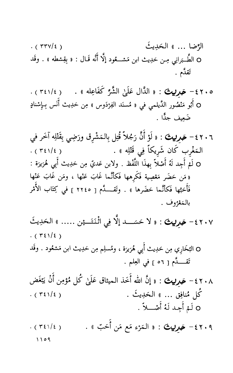 4206 حديث ( لو أن رجلاً قتل بالمشرق ورضي بقتله آخر في المغرب كان شريكاً في قتله ) ( 4 / 341 ) + لم أجد له أصلاً بهذا اللفظ ولابن عدي من حديث أبي هريرة ( من حضر معصية فكرها فكأنما غاب عنها ومن غاب عنها فأحبها فكأنما حضرها ) وتقدم 2245 في كتاب الأمر بالمعروف +