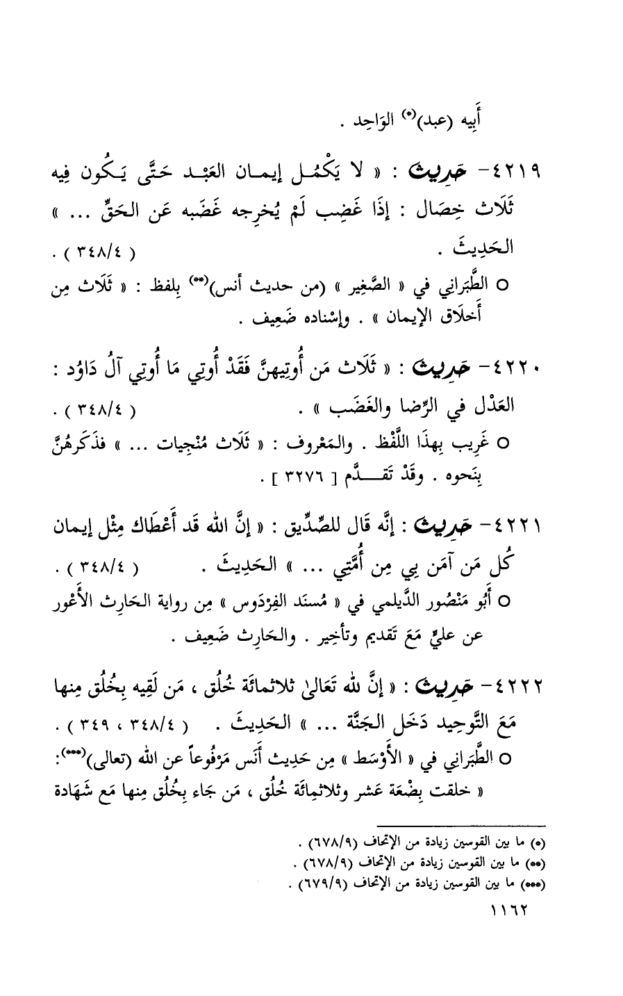 4219 حديث ( لا يكمل إيمان العبد حتى يكون فيه ثلاث خصال إذا غضب لم يخرجه غضبه عن الحق . . . ) الحديث ( 4 / 348 )