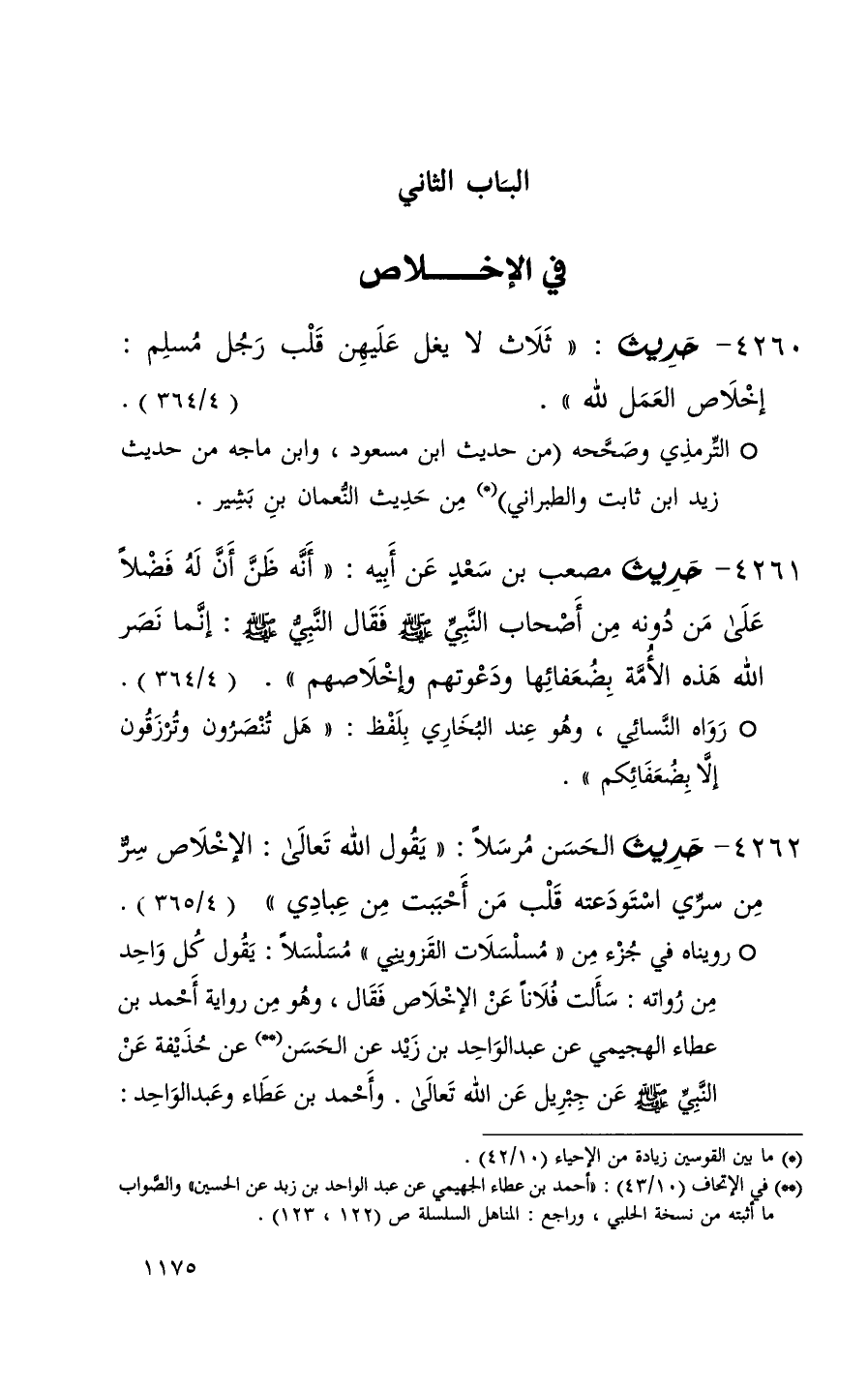 4260 حديث ( ثلاث لا يغل عليهن قلب رجل مسلم إخلاص العمل لله ) ( 4 / 364 ) (1)