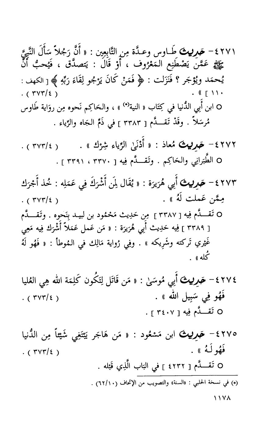 4274 حديث أبي موسى ( من قاتل لتكون كلمة الله هي العليا فهو في سبيل الله ) ( 4 / 373 ) + تقدم فيه 3407 +