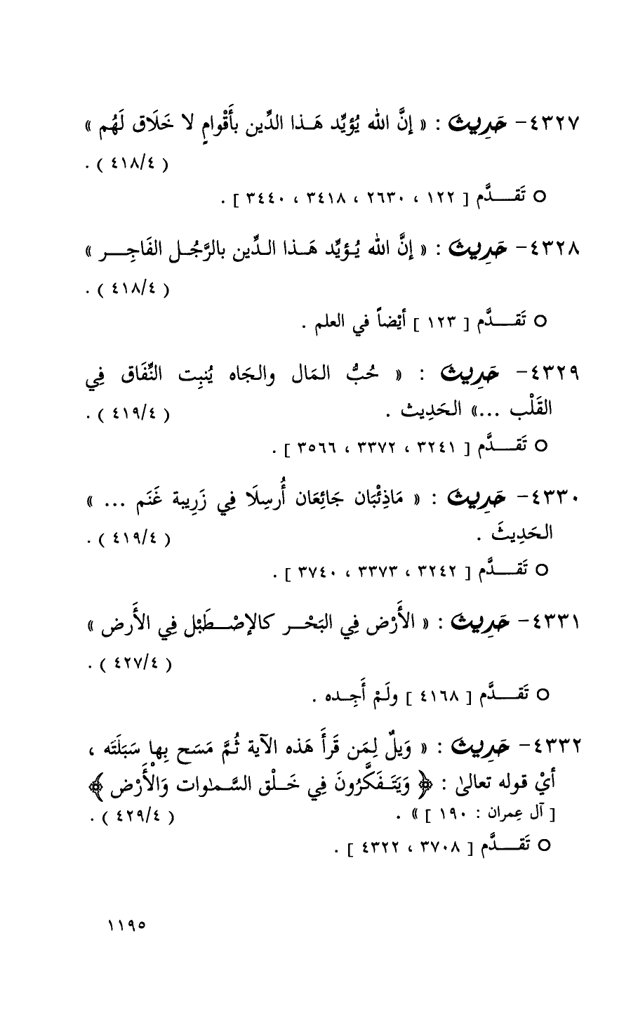 4328 حديث ( إن الله يؤيد هذا الدين بالرجل الفاجر ) ( 4 / 418 ) + تقدم 123 أيضاً في العلم +
